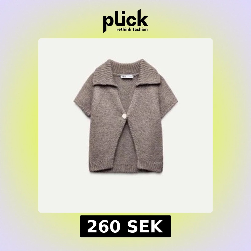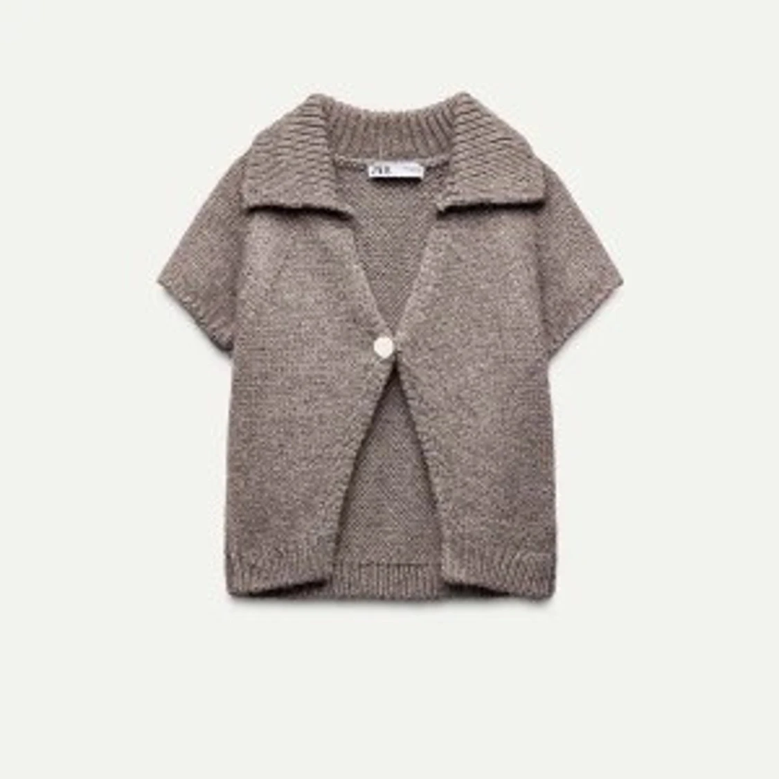 Snygg brun stickad kofta från Zara med korta ärmar och bred krage. Västen har en croppad passform och stängs med en knapp framtill. Perfekt att styla över en t-shirt eller linne för en chill look.🧸🧸