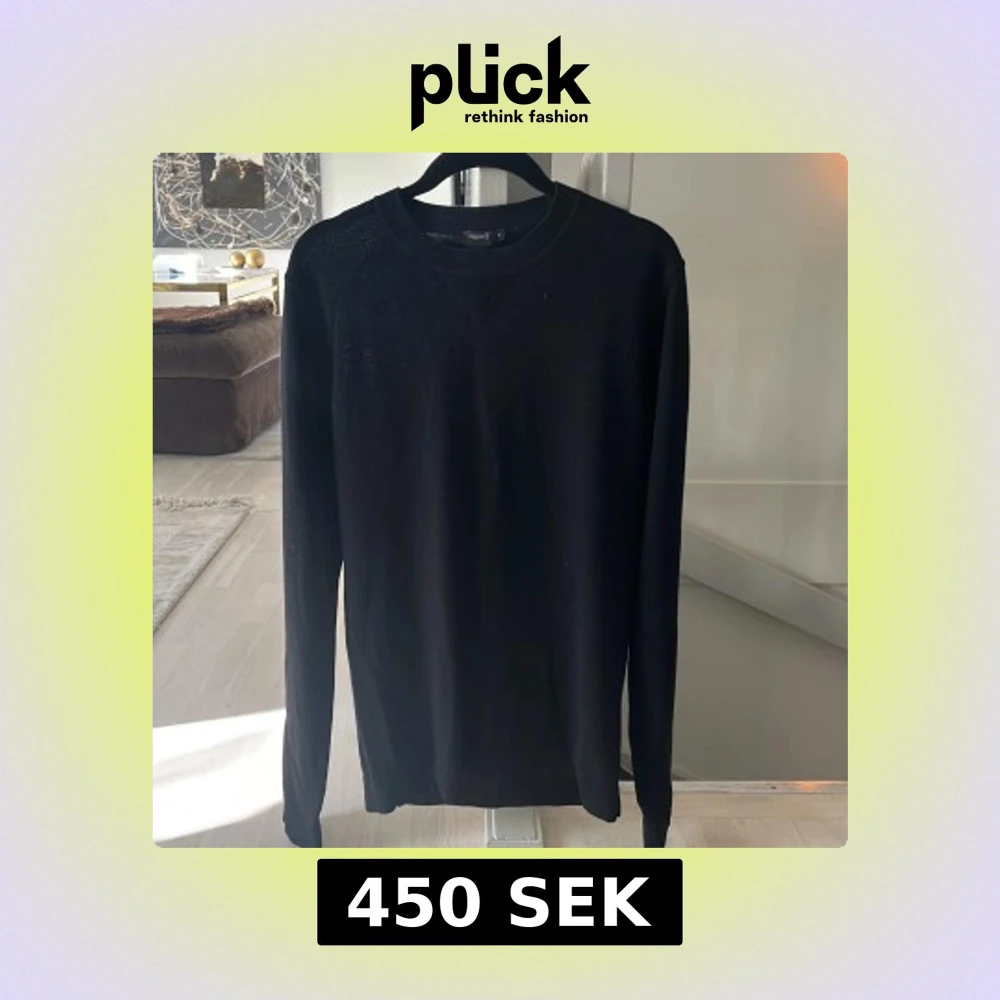 Säljer en stilren svart crewneck från Filippa K i 100% merinoull. Tröjan har en klassisk design med rund hals och långa ärmar, perfekt för en elegant och bekväm look. Den är i bra skick och sitter bra