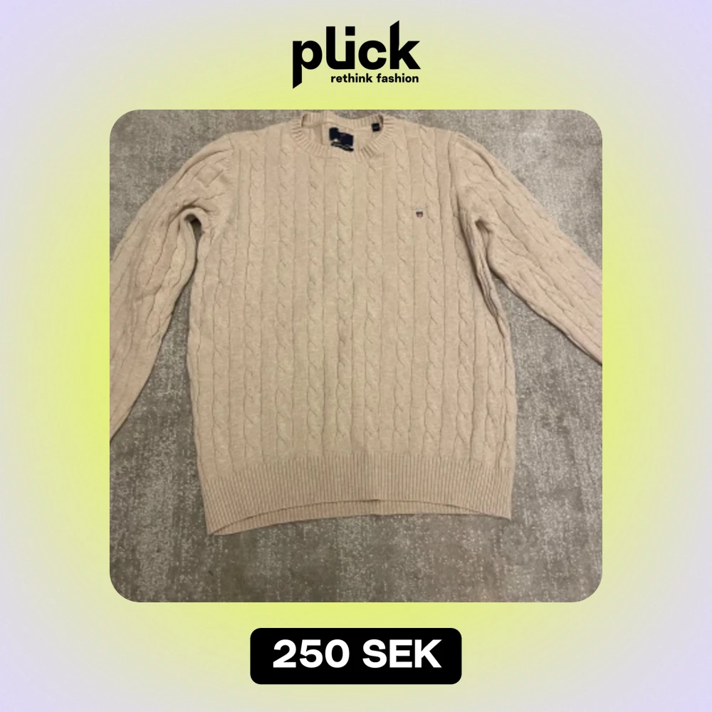 Säljer en snygg beige GANT tröja med kabelstickat mönster. Den har långa ärmar och ribbade muddar vid ärmslut och nederkant. Perfekt för kyliga dagar! bara att höra av sig vid intresse!