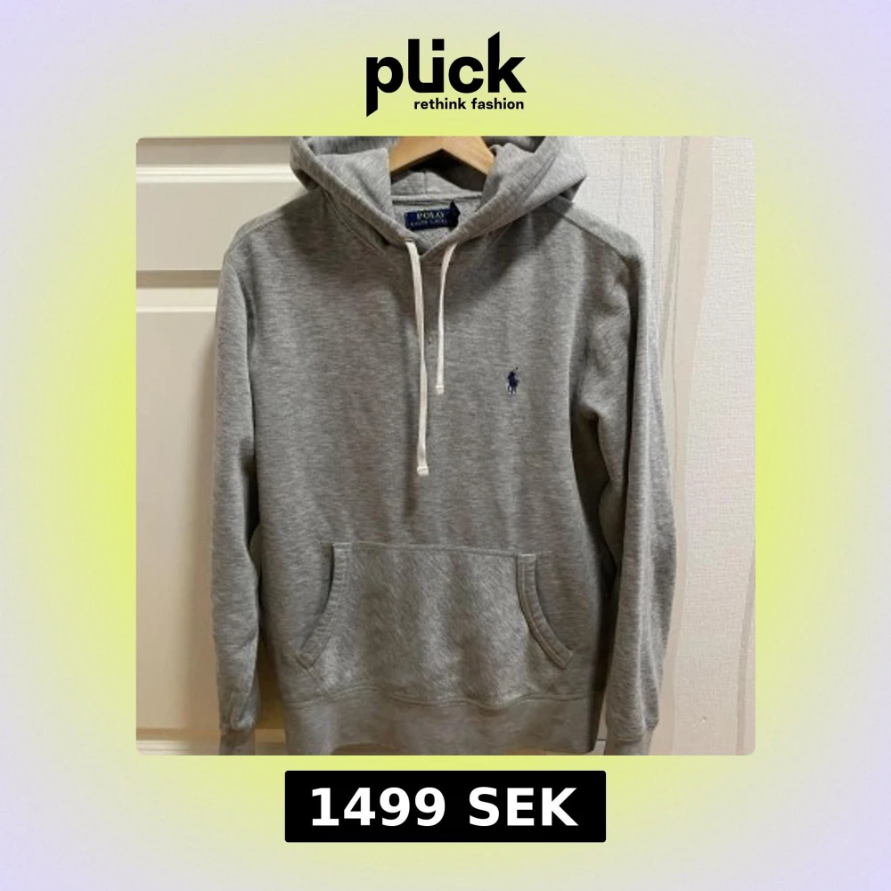 Säljer en klassisk grå hoodie från Polo Ralph Lauren med broderad blå logga på bröstet. Tröjan har huva med vita snören och en stor magficka. Perfekt för en avslappnad stil.