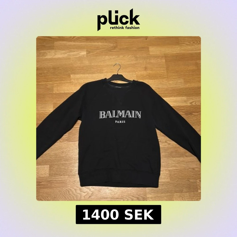 Säljer en stilren svart sweatshirt från Balmain med deras ikoniska logga tryckt på framsidan. Tröjan är tillverkad i mjuk bomull och har långa ärmar samt ribbade muddar vid ärmslut och nederkant. Perfekt för en casual look. Skick: 9/10 (använd fåtal gånger). Priset går att diskutera!