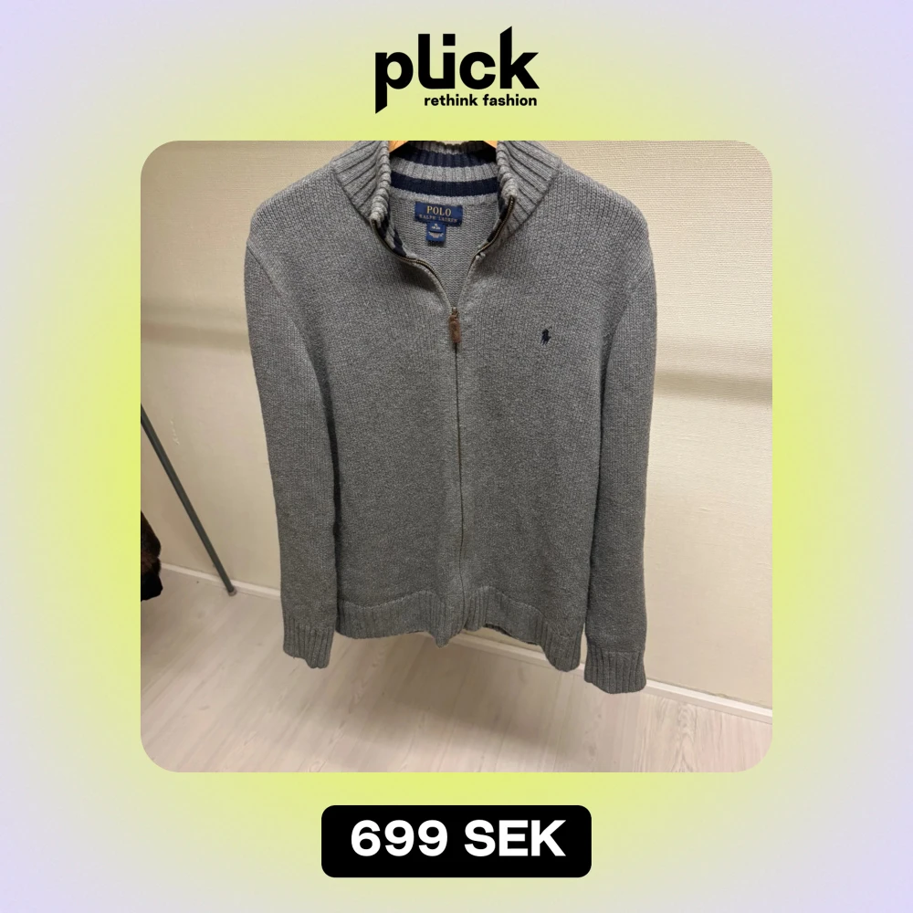 Säljer en stilren grå stickad tröja från Polo Ralph Lauren med dragkedja och broderad logotyp på bröstet. Tröjan har en hög krage och ribbade muddar för extra komfort. Perfekt för kyliga dagar! Storlek XL i barn så passar S i vuxen