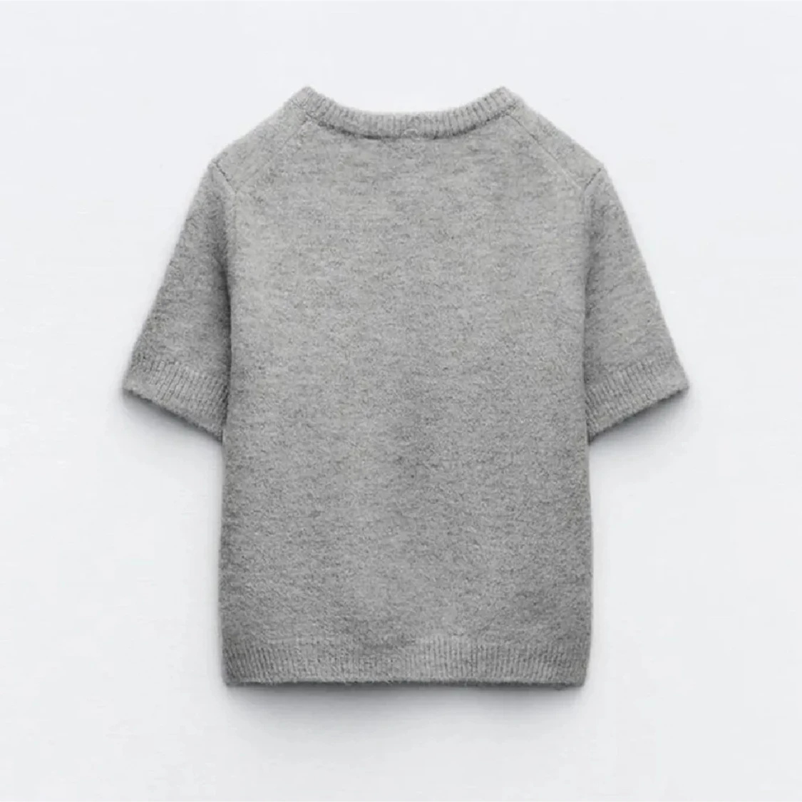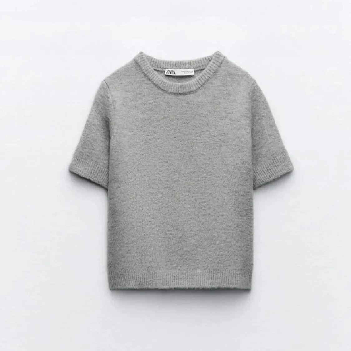 Säljer en grå kortärmad stickad tröja från Zara. Tröjan har en rund halsringning och är tillverkad i ett mjukt material som ger en bekväm passform. Perfekt till vardags 🩶