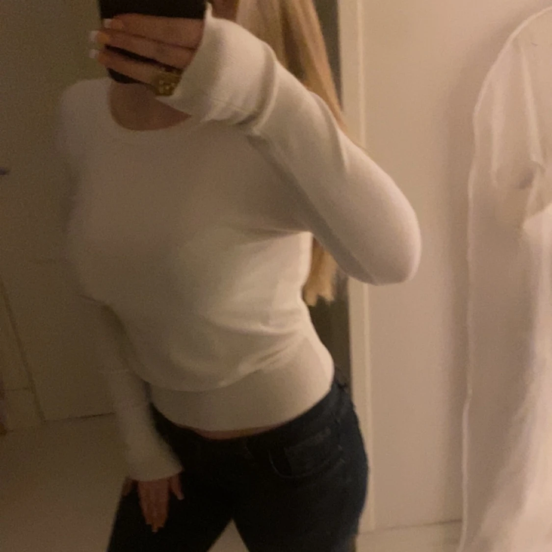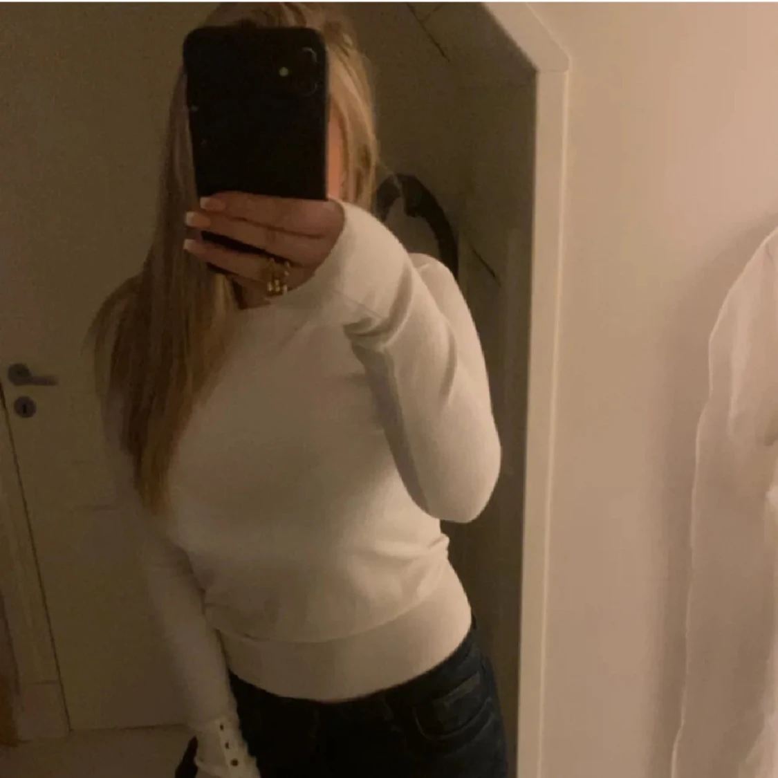 Supersnygg vit tröja med lång ärm och coola guldknappar på ärmsluten. Tröjan har en tight passform och bred mudd i midjan. Perfekt för dig som gillar stilrena plagg med en twist!