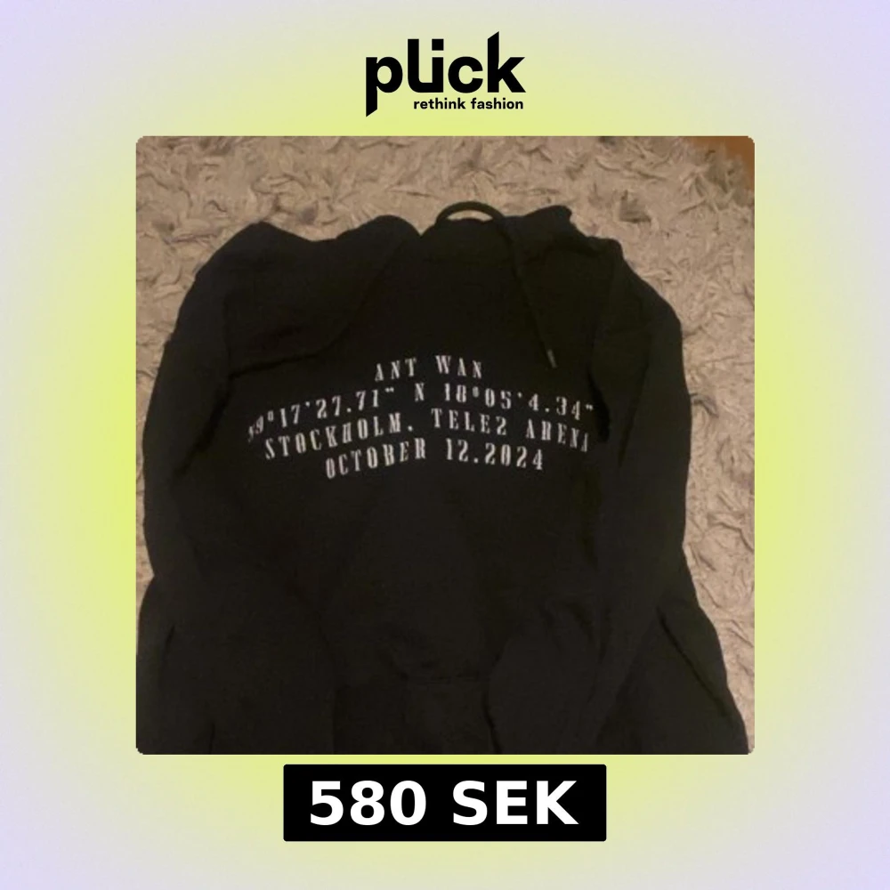 Svart hoodie med tryck fram och bak från Ant Wan. På framsidan står det koordinater, datum och plats för konsert på Tele2 Arena i Stockholm. Baksidan har ett stort färgglatt motiv och texten 'Ant Wan at Tele2 Live in Stockholm 2'.