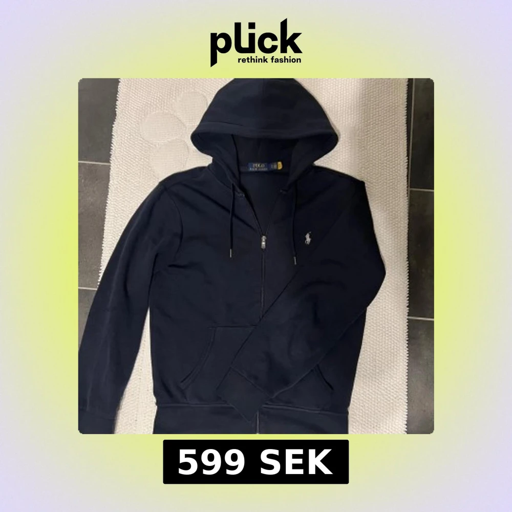 Säljer en mörkblå hoodie från Polo Ralph Lauren med dragkedja och den klassiska loggan broderad på bröstet. Tröjan har långa ärmar och en praktisk huva med snörning. Storleken är xs men passar s-m