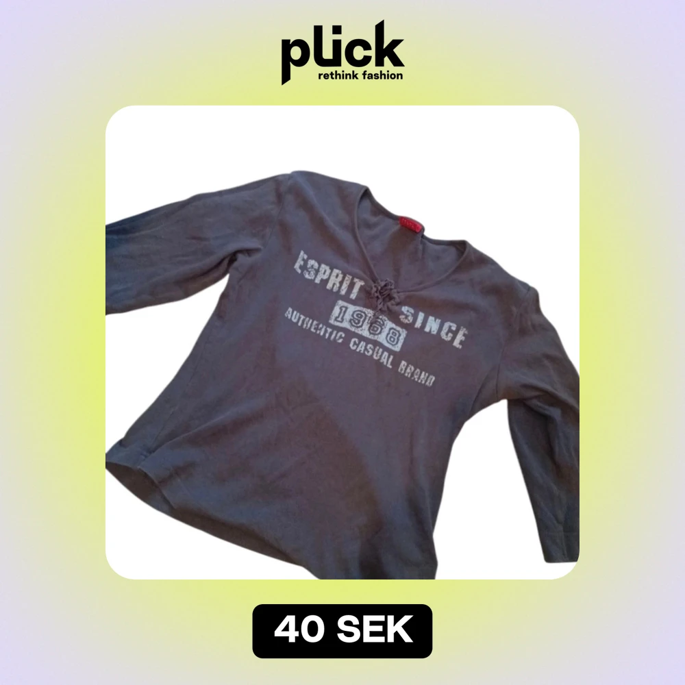 Säljer en grå tröja från Esprit med texten 'Esprit Since 1968' på framsidan. Tröjan har en v-ringad hals med knytning och trekvartsärmar.