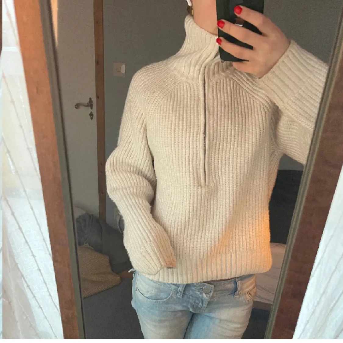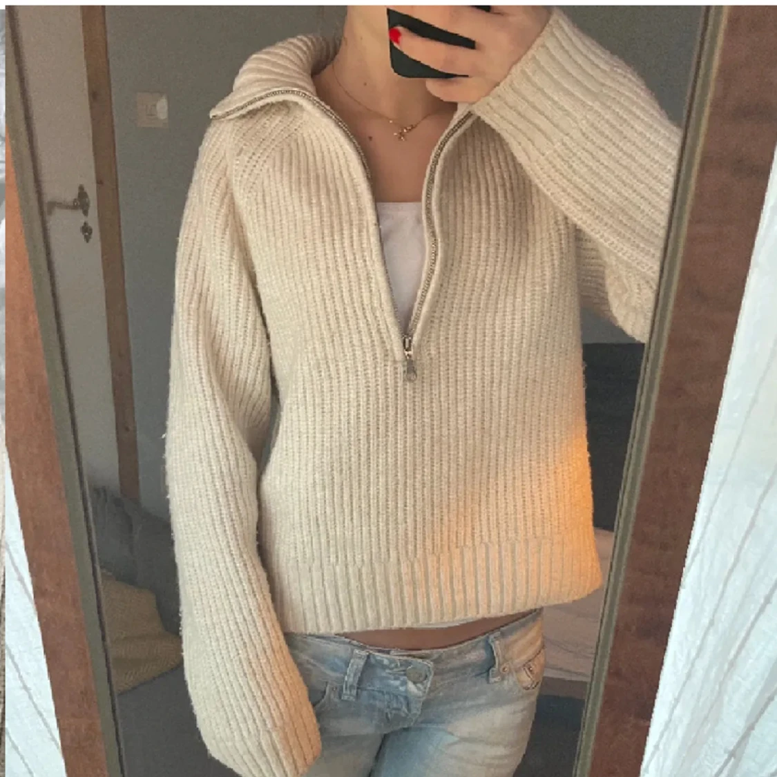 jättesnygg vit/beige tjocktröja med zip-krage. jättebra skick o perfekt till vintern o våren🤍 står strl M men passar även S. har fler bilder 💕
