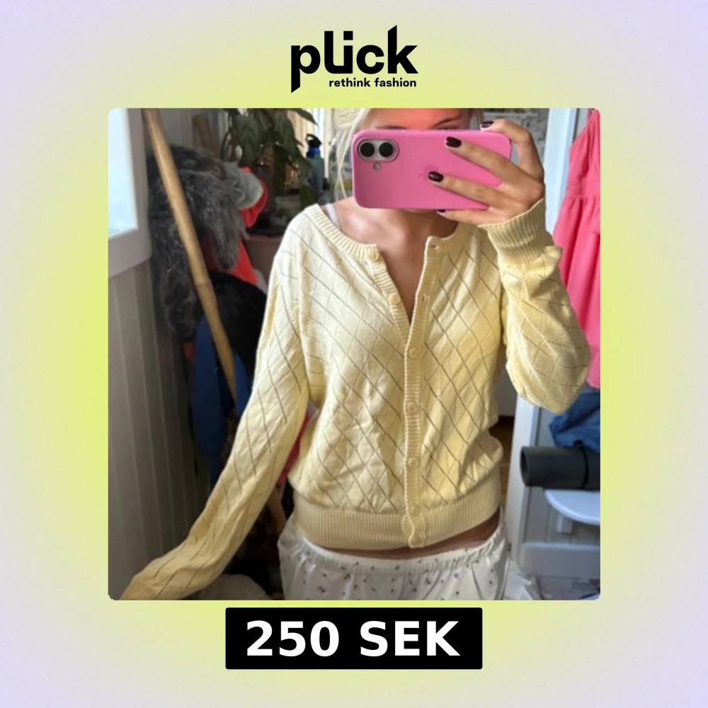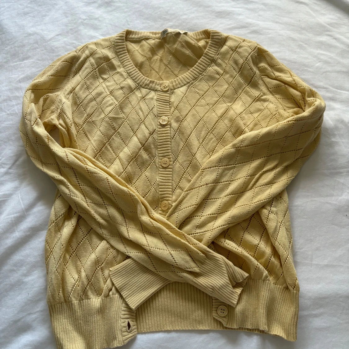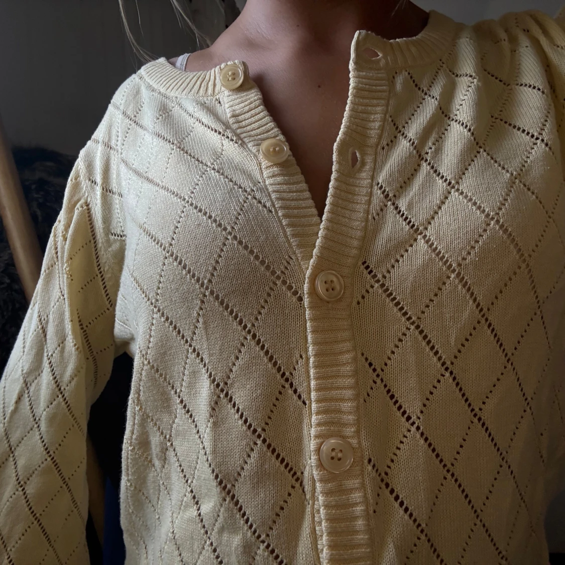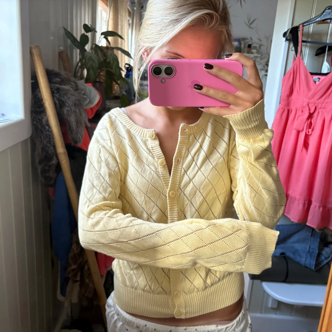 Söt ljusgul kofta med rutigt hålmönster och rund hals. Tröjan har långa ärmar, ribbade muddar och knappar framtill. Perfekt att slänga över en topp för en chill look.💛💛💛