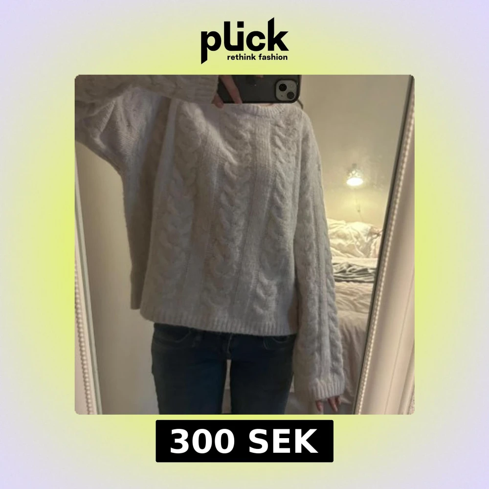 Mysig vit stickad tröja med kabelstickat mönster och långa ärmar. Tröjan har en loose passform och bred ribbad kant nedtill och vid ärmsluten. Perfekt för kyliga dagar och enkel att matcha med jeans eller kjol.