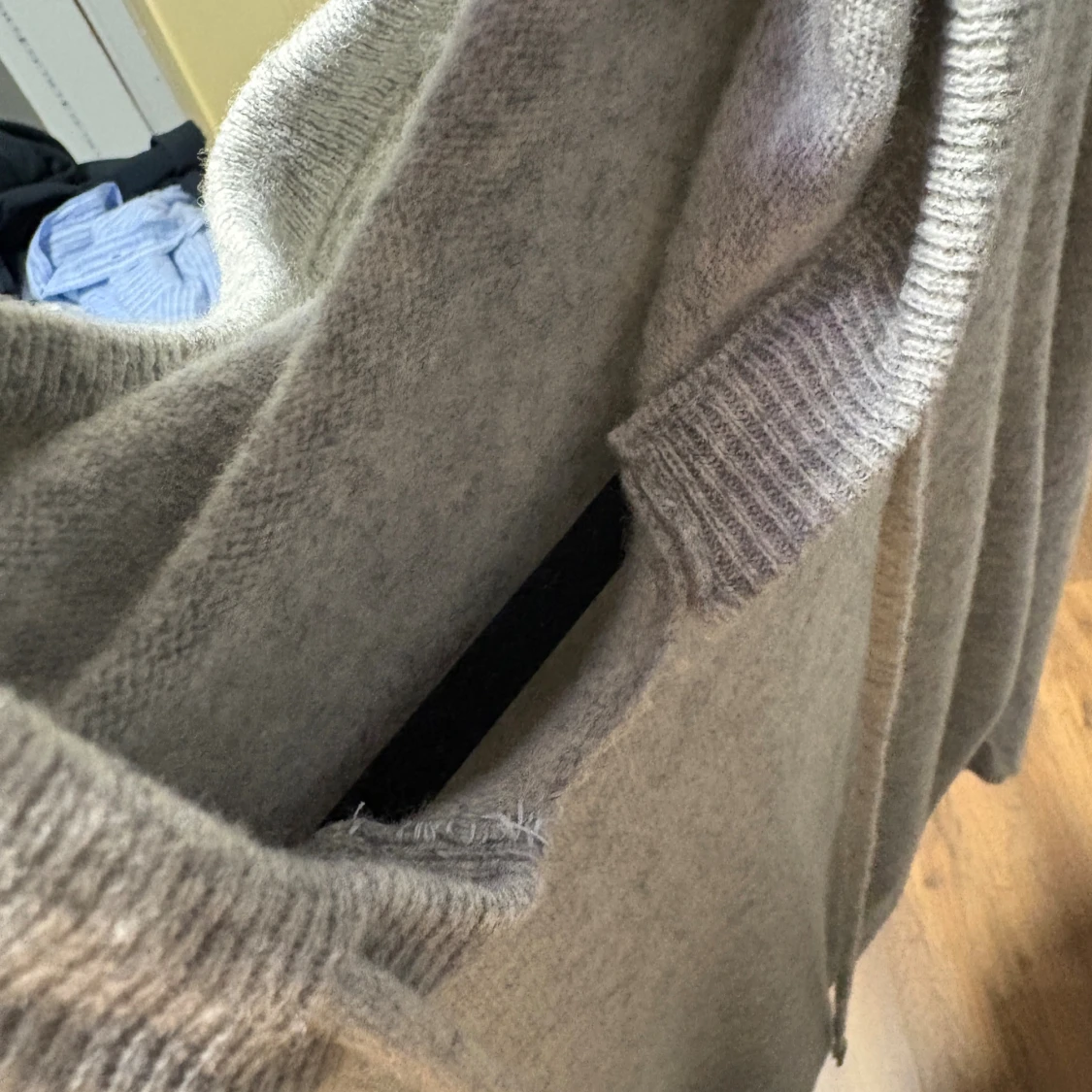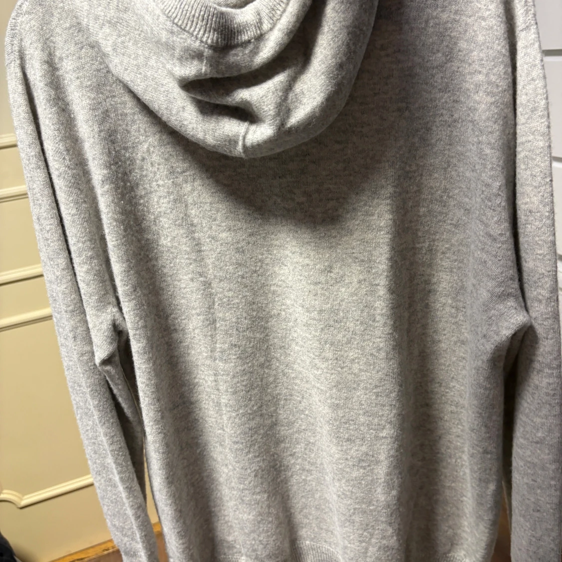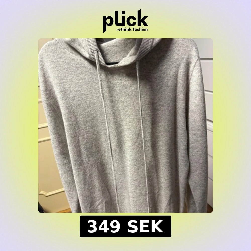 Deffekt på ”kragen” i mitten som jag visar på sista bilden.Mysig ljusgrå hoodie med huva och snörning. Tröjan är stickad i mjuk kashmirblandning och har långa ärmar samt ribbade muddar. Perfekt för chill dagar eller när du vill vara extra bekväm.