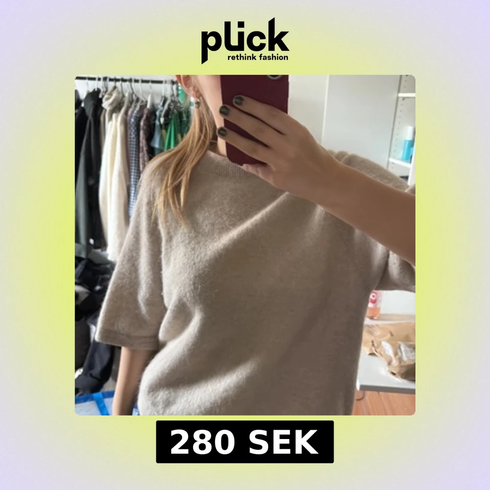 Mysig beige stickad tröja med rund halsringning och korta ärmar. Tröjan har en enkel och stilren design som passar perfekt till många olika outfits.