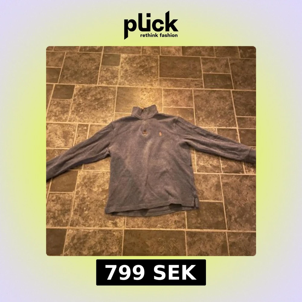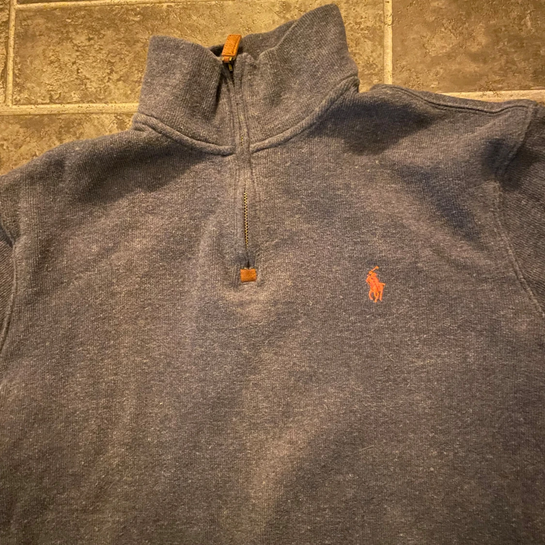 Säljer en stilren grå tröja från Ralph Lauren med dragkedja och orange broderad logga på bröstet. Tröjan har långa ärmar och en hög krage, perfekt för kyligare dagar.