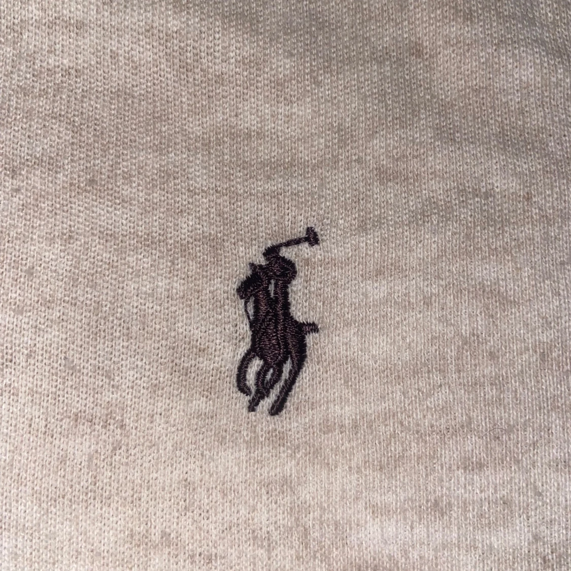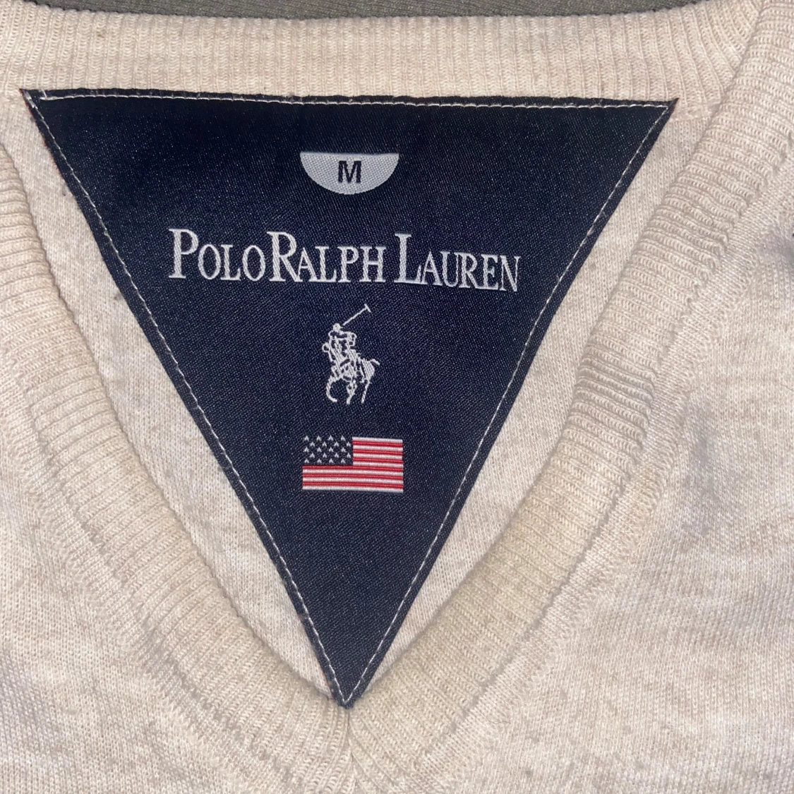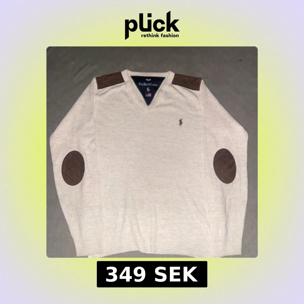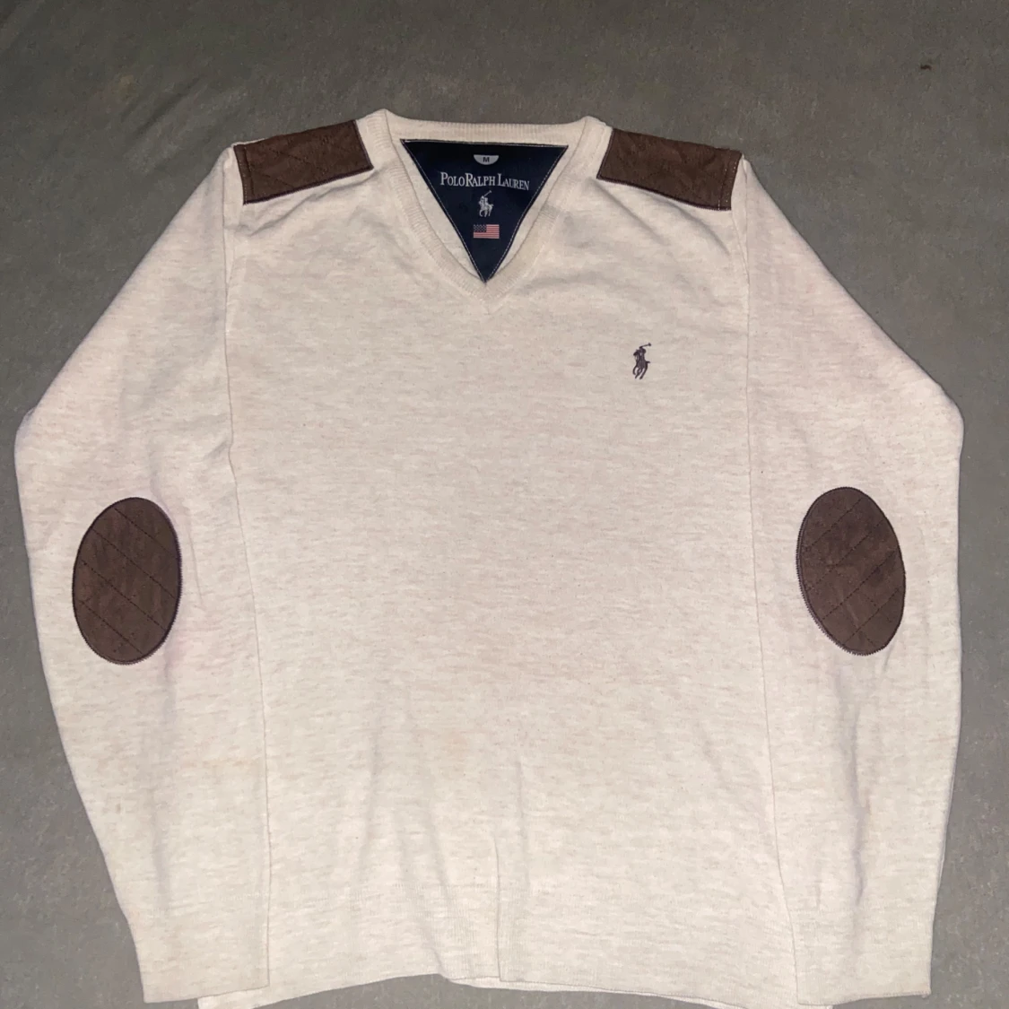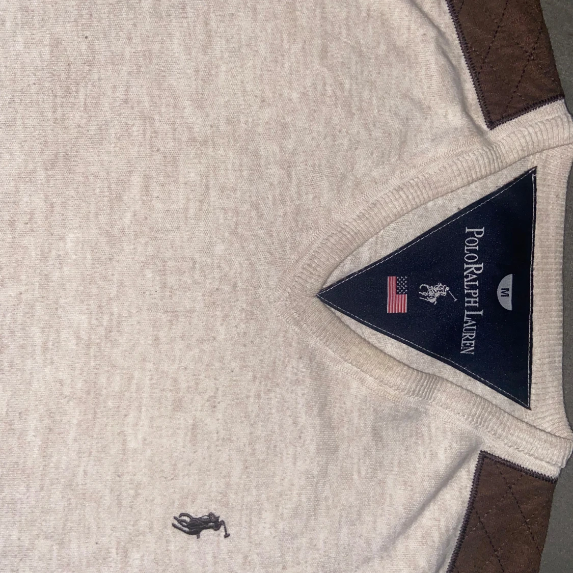 Snygg beige v-ringad tröja från Polo Ralph Lauren med bruna mockadetaljer på axlar och armbågar. Broderad logga på bröstet. Tröjan är stickad och har långa ärmar, perfekt för lager-på-lager under höst och vinter.