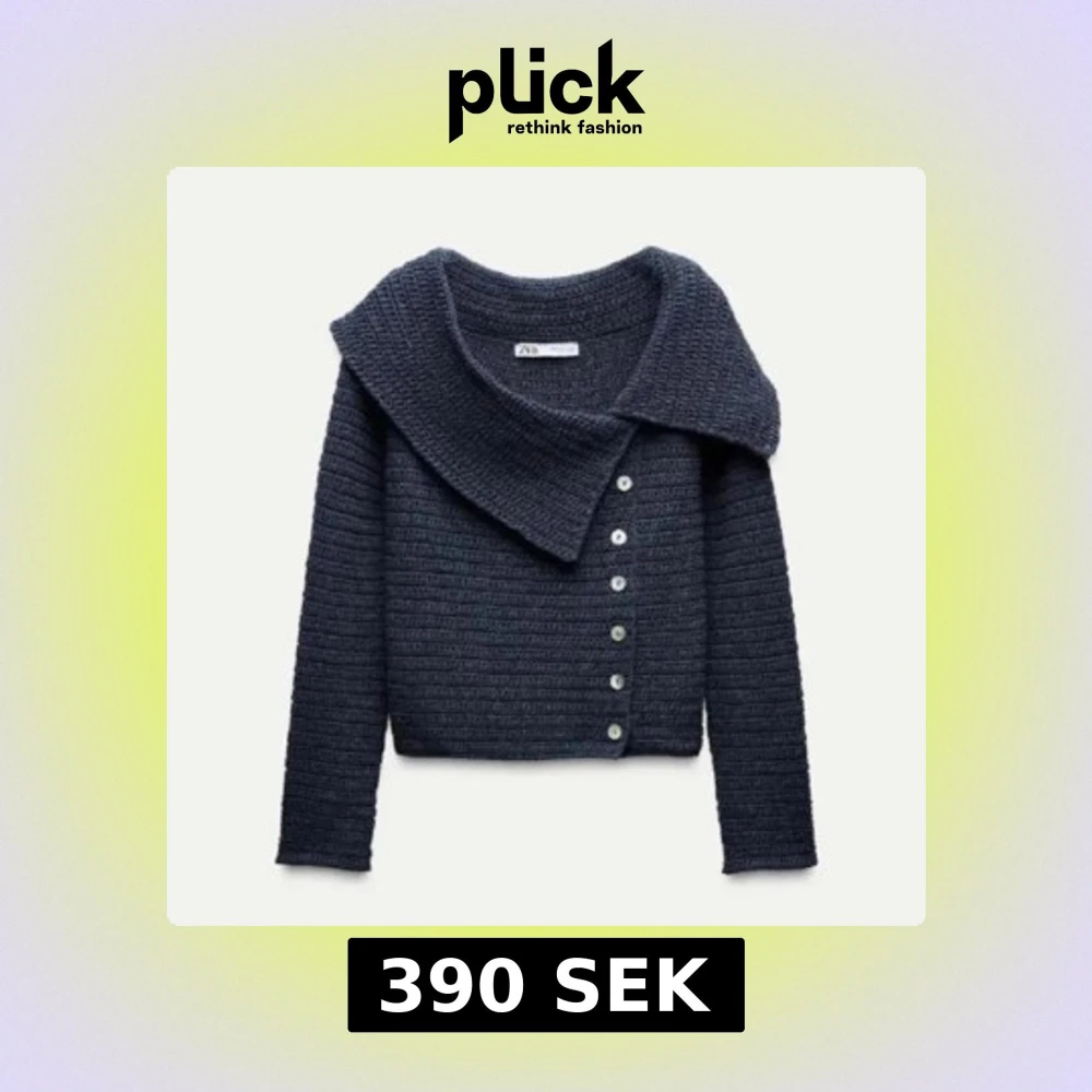 Snygg mörkblå stickad kofta från Zara med bred krage och knappar längs framsidan. Koftan har lång ärm och ett ribbat mönster som ger en cool struktur. Perfekt för lager-på-lager och chillare dagar.