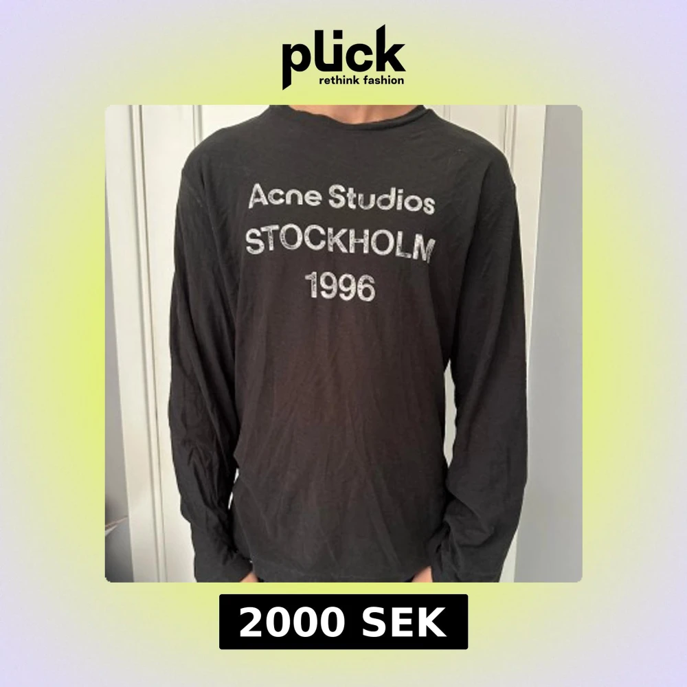 Svart långärmad tröja från Acne Studios med vit text 'Acne Studios STOCKHOLM 1996' på bröstet. Tröjan har en avslappnad passform och är tillverkad i mjuk bomull, perfekt för en stilren och enkel look. Nypris 3500kr! Mitt pris 2000