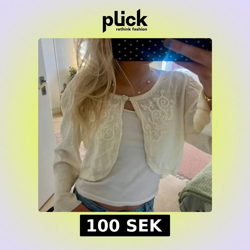 Supersöt vit kofta från Soyaconcept med broderade detaljer framtill och en liten knapp vid halsen. Croppad modell med långärmade puffärmar och ribbade muddar. Perfekt att slänga över ett linne för en chill och feminin look.