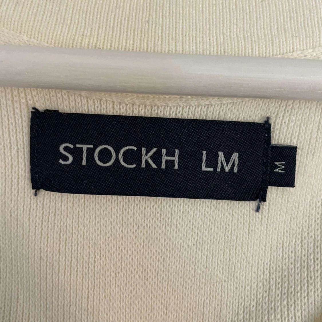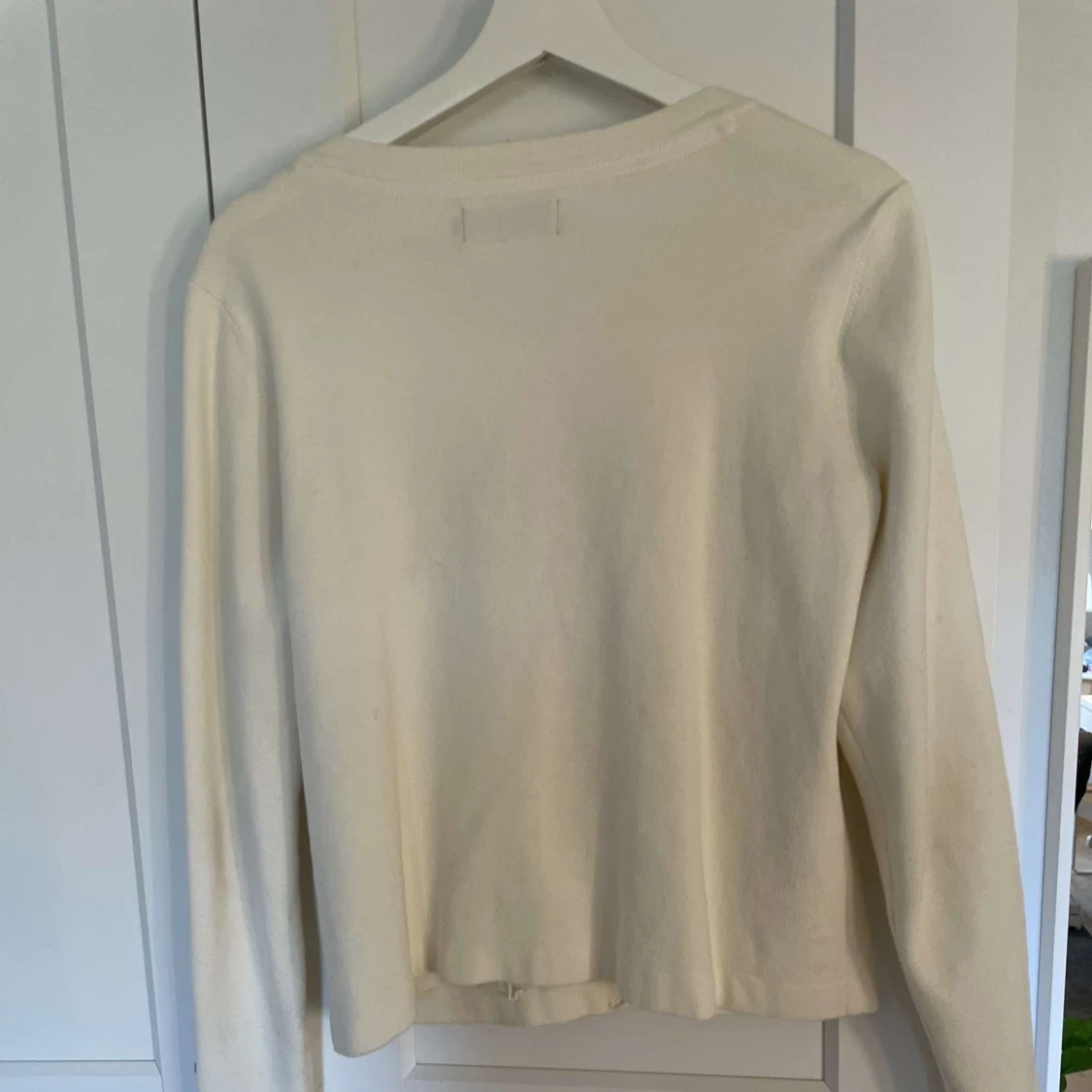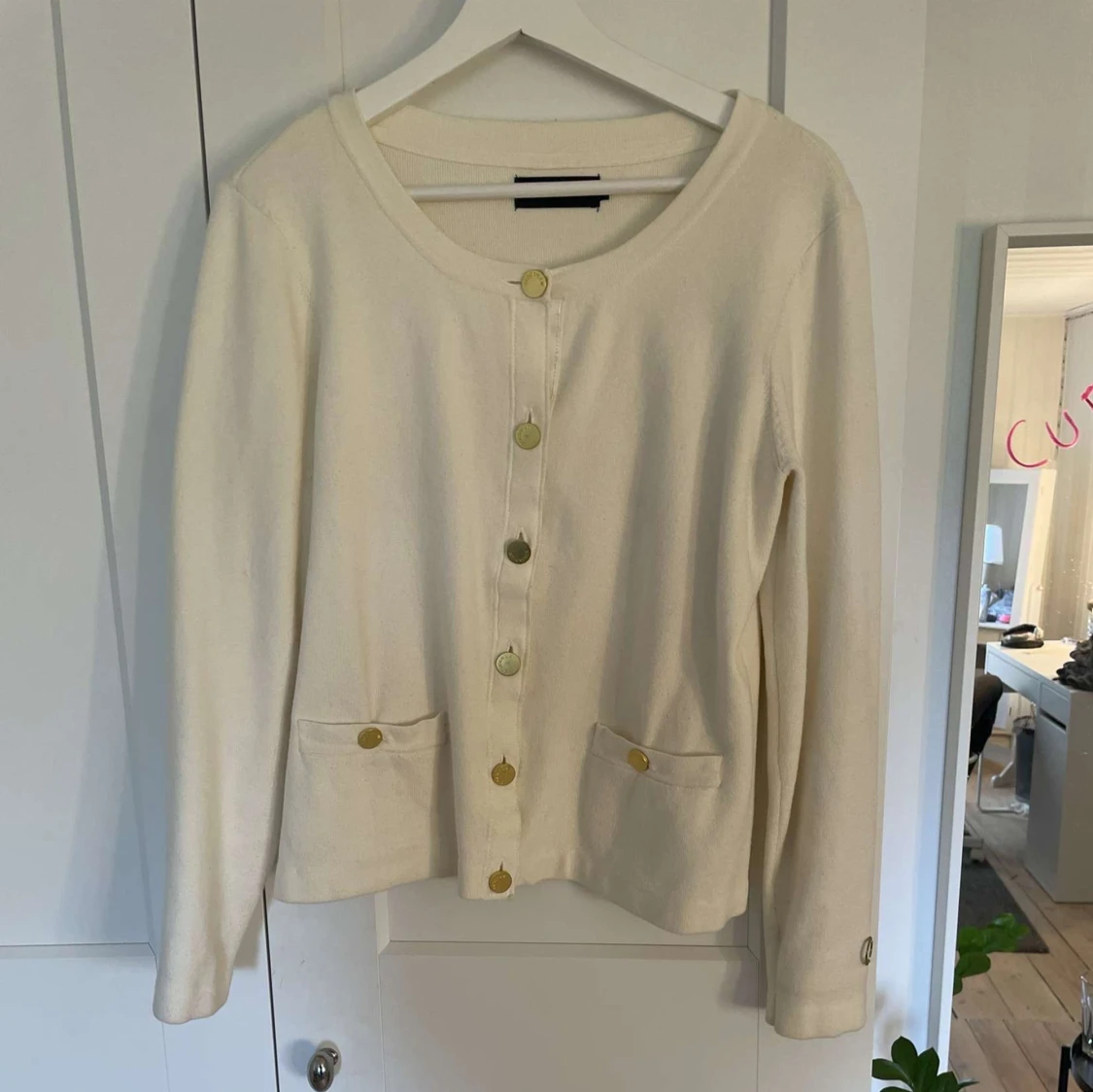 Säljer en stilren vit kofta från Stockh LM med rund halsringning och dekorativa guldknappar framtill. Koftan har två fickor fram och långa ärmar. Storlek M💗Använd inte köp nu!