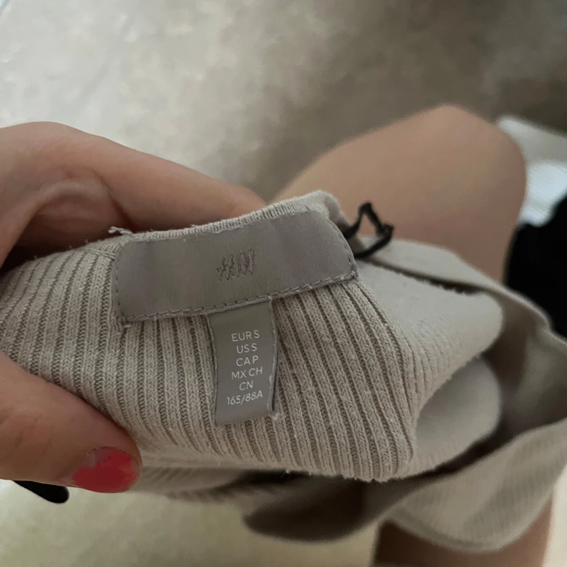 Superfin beige ribbad topp från H&M med lång ärm och fyrkantig urringning. Sitter tight och har en stretchig passform som framhäver figuren. Perfekt att styla med jeans eller kjol för en clean look.