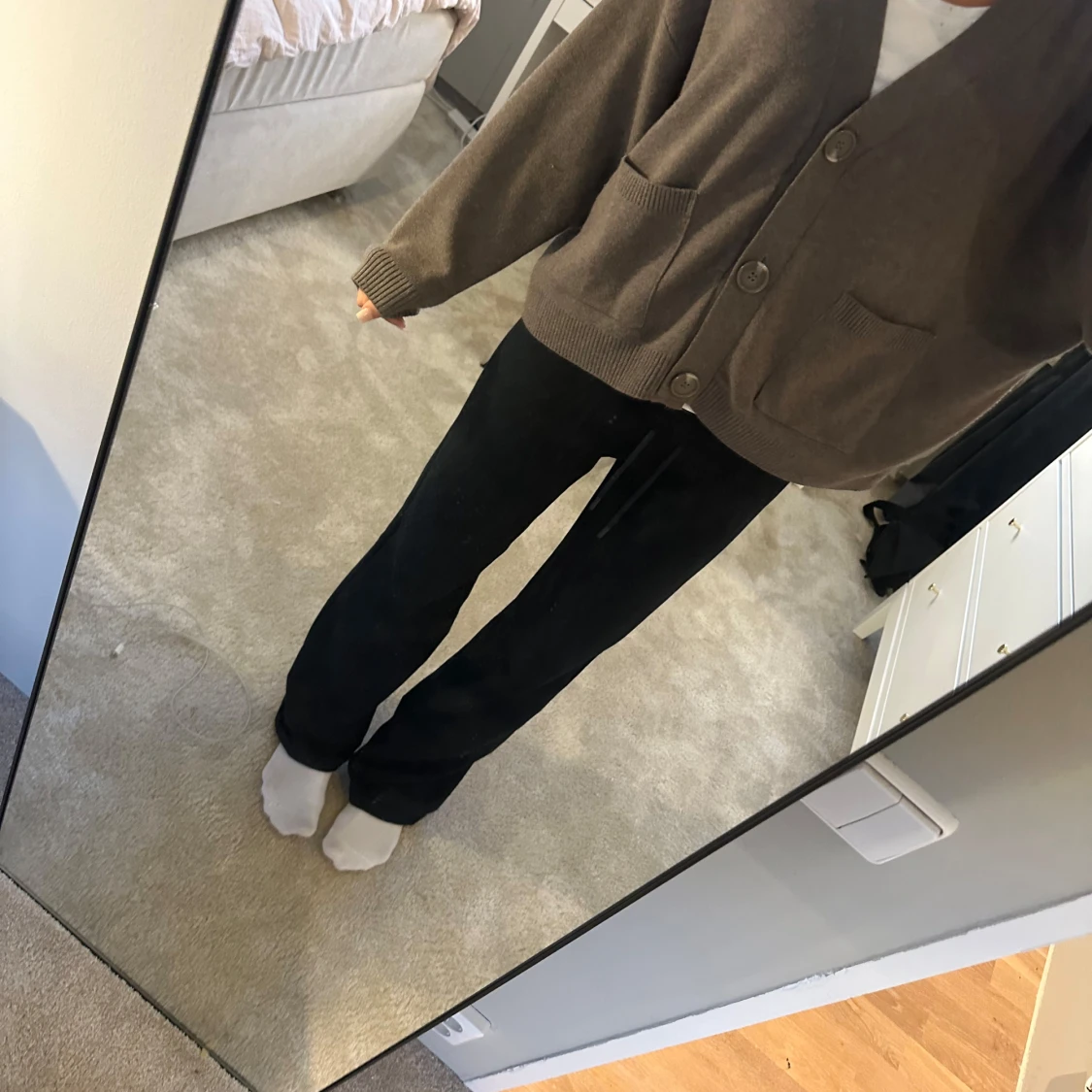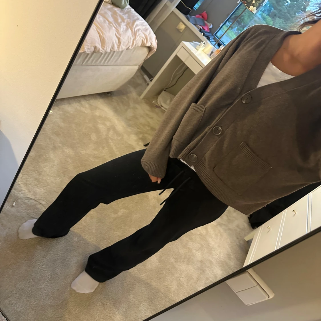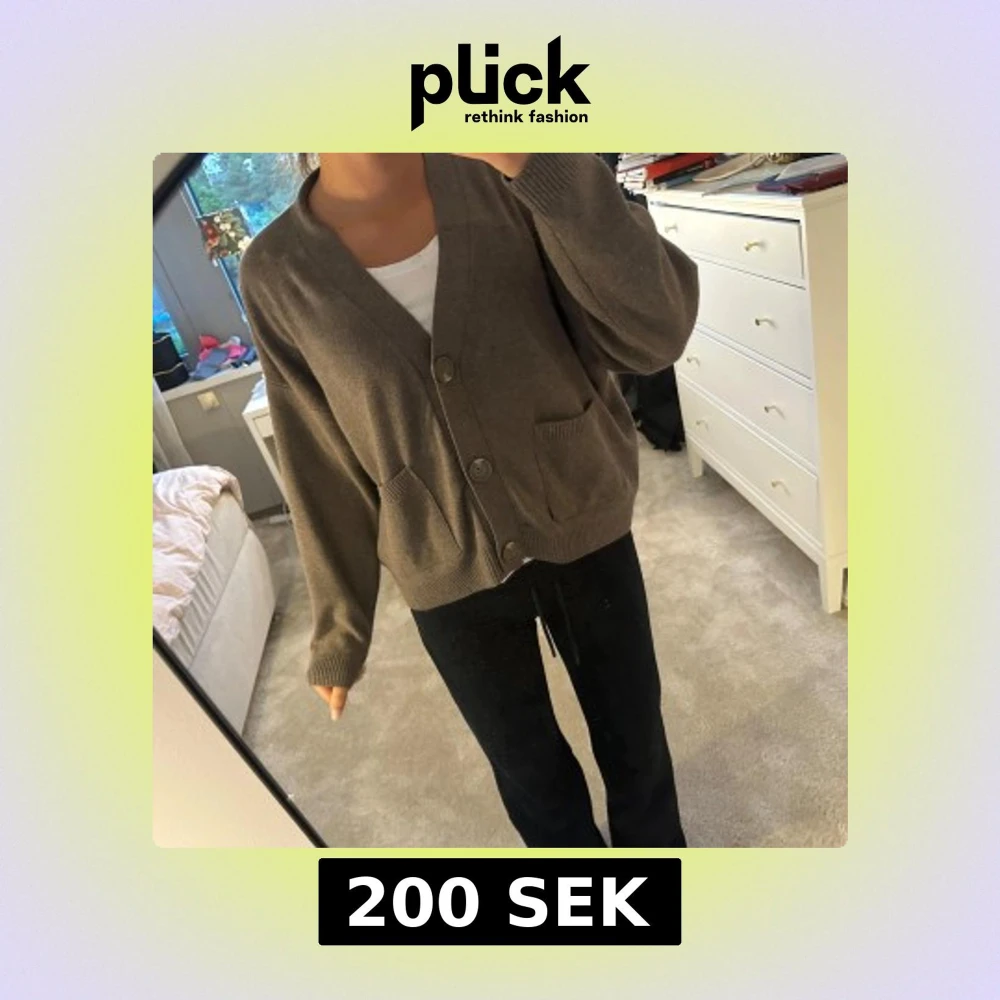 Mysig brun kofta med v-ringning, stora knappar framtill och två praktiska fickor. Modellen är lite loose och har långa ärmar samt ribbade muddar. Passar mig som brukar ha S/M🥰