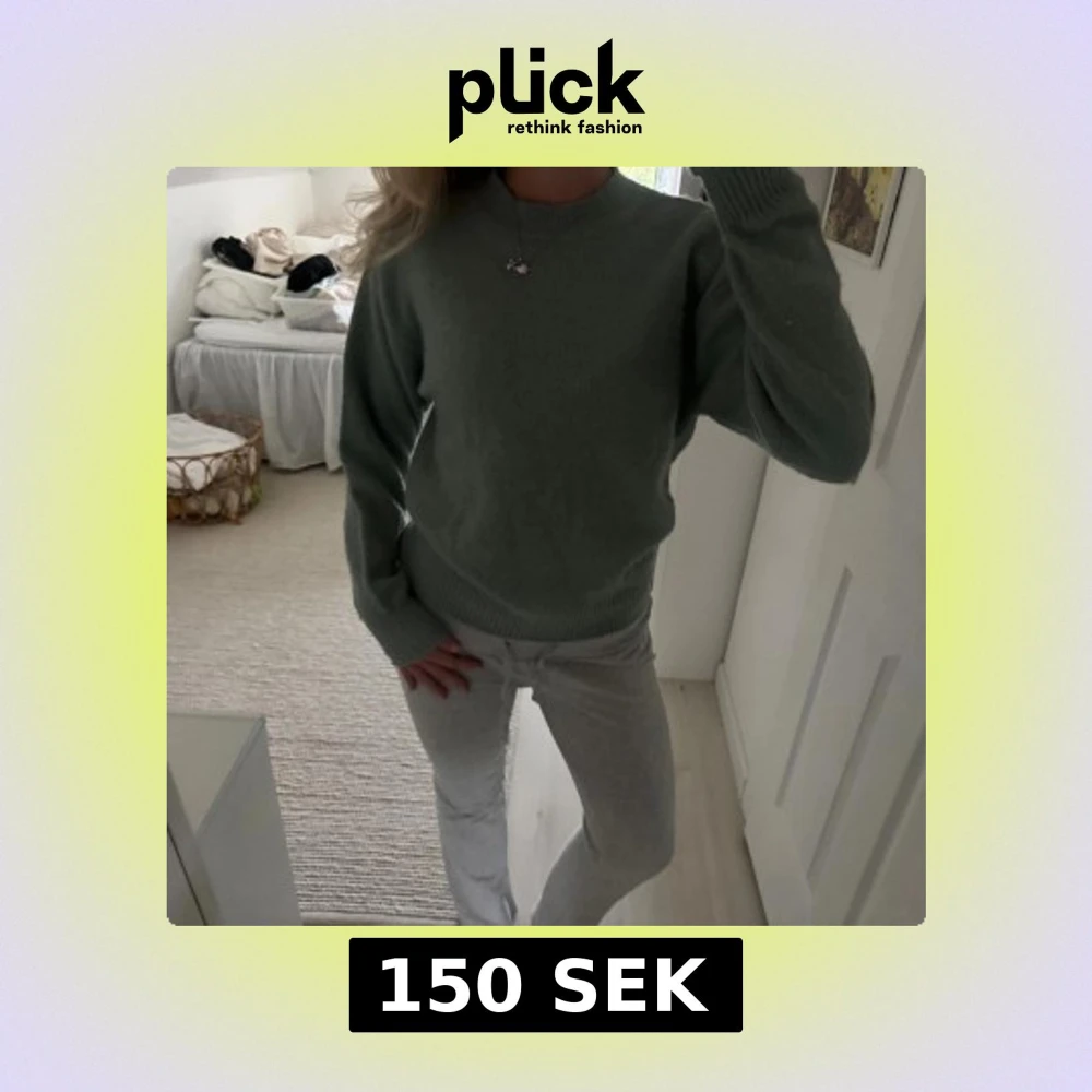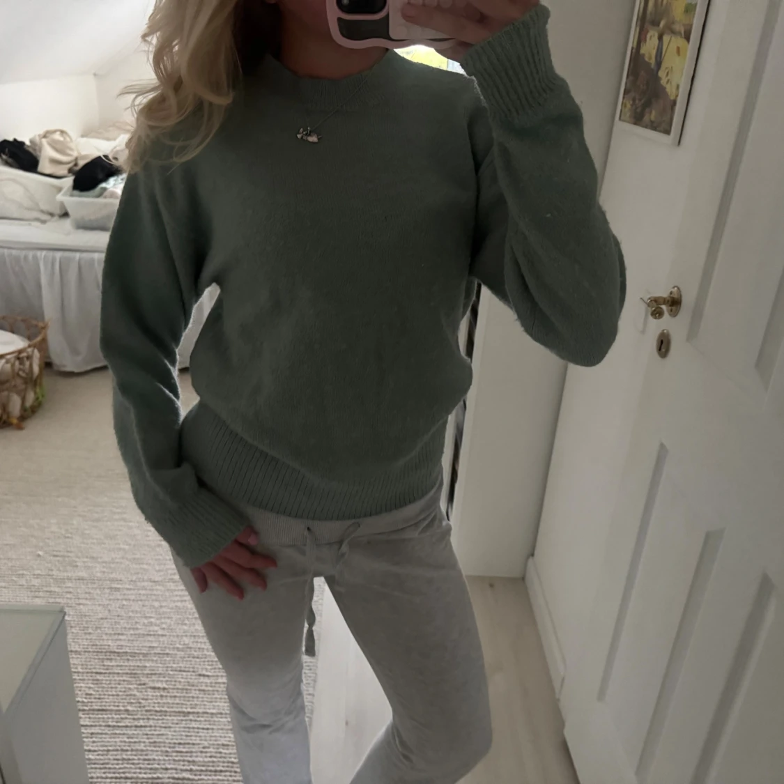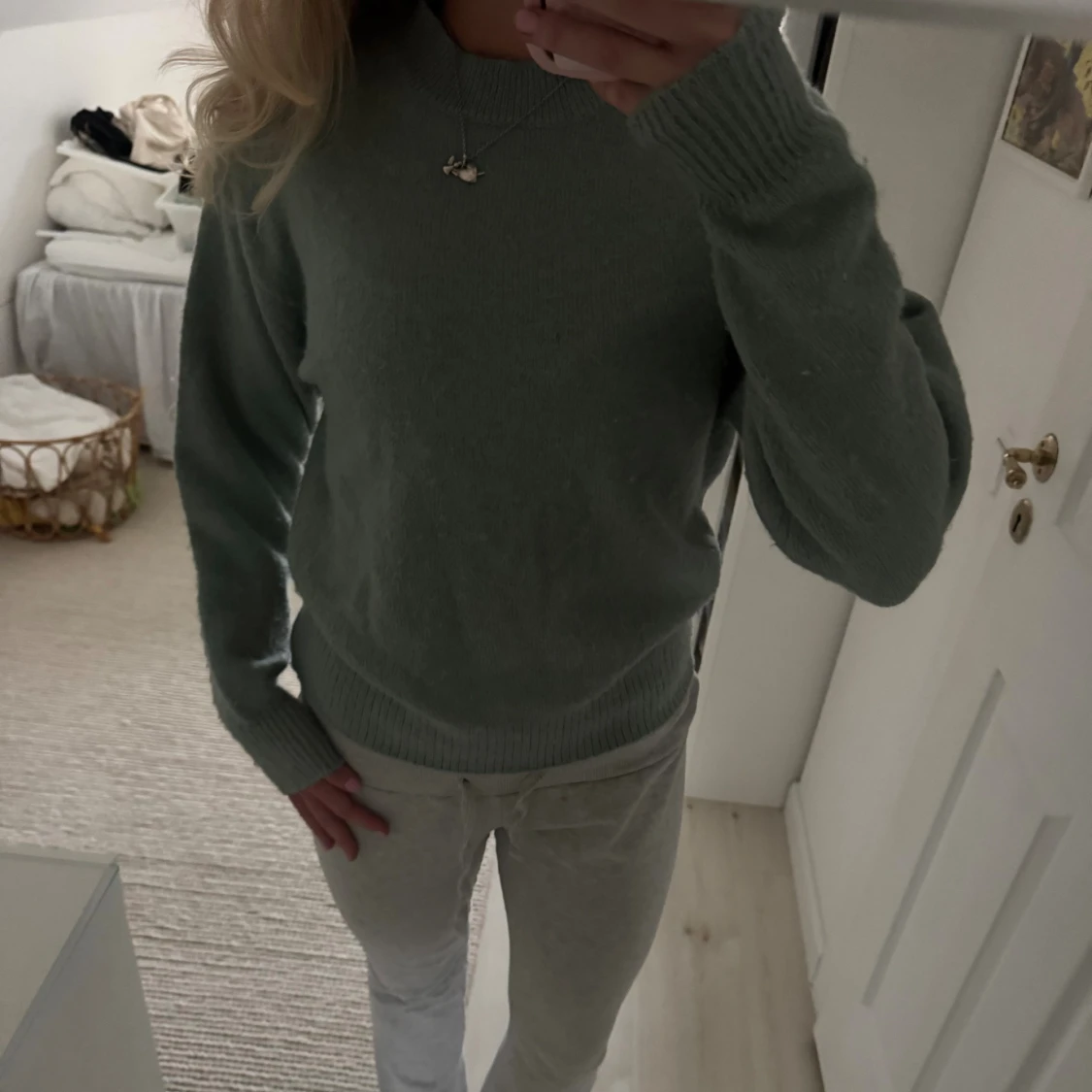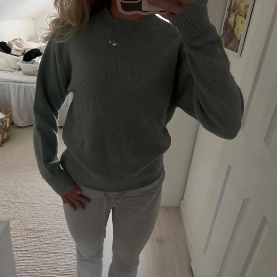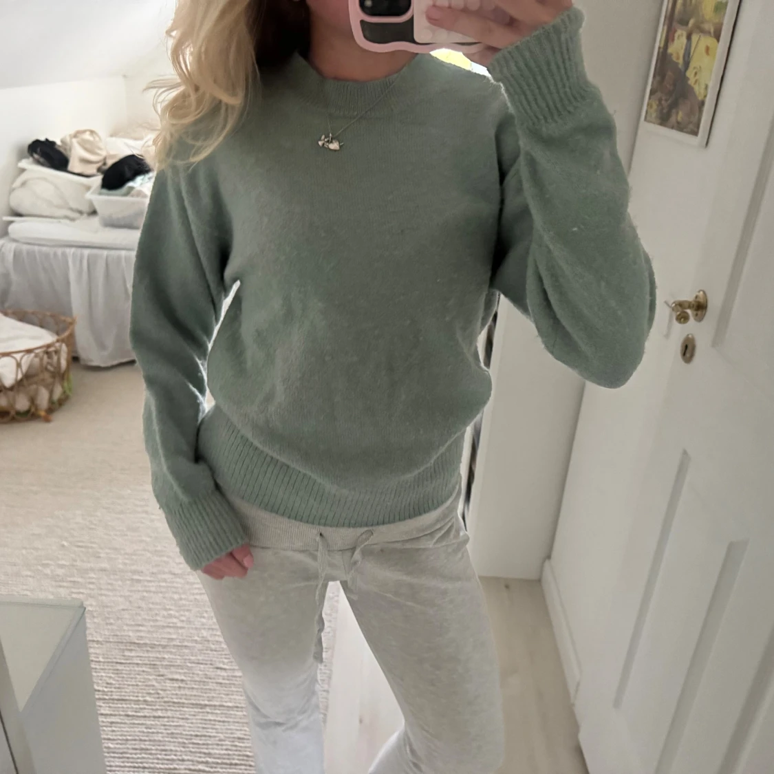 Mysig grön stickad tröja med rund halsringning och ribbade muddar vid ärmslut och nederkant. Perfekt för lager-på-lager och passar till både jeans och mjukisbyxor. Enkel och stilren design som funkar året runt.