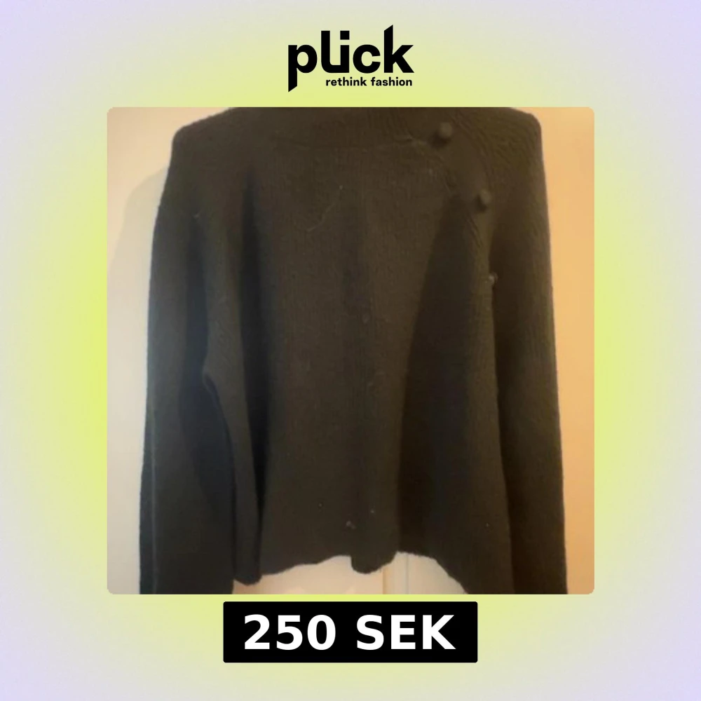 Mysig svart stickad tröja med långa ärmar och dekorativa knappar längs axeln. Perfekt för kyligare dagar och enkel att matcha med olika outfits.