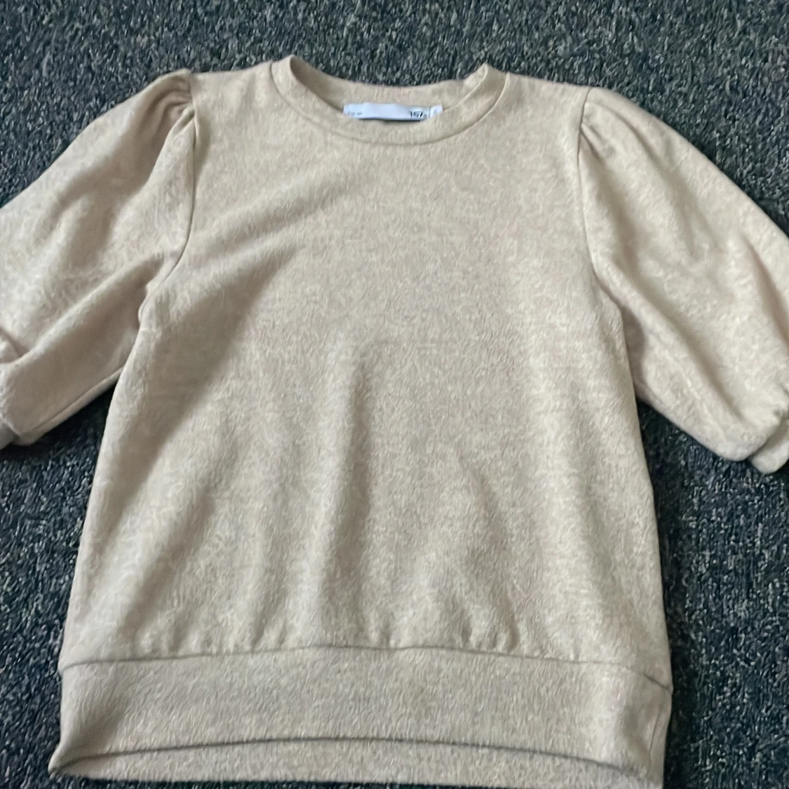 Säljer en stilren beige tröja med puffärmar. Tröjan har en rund halsringning och är tillverkad i ett mjukt material. Perfekt för en avslappnad look.