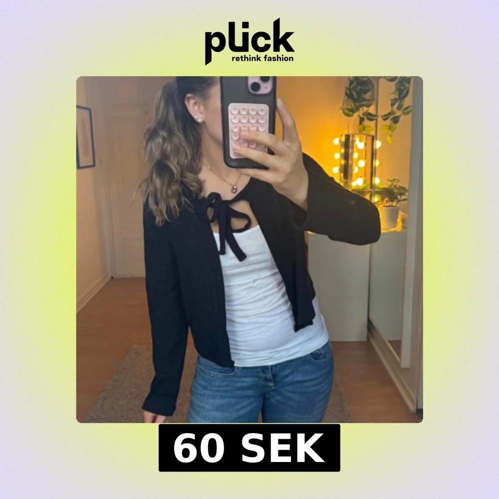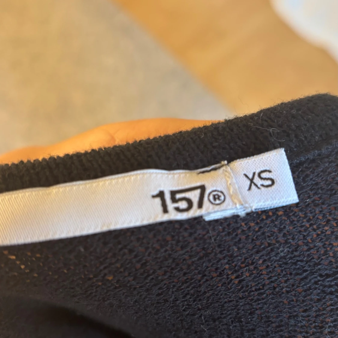 Svart stickad kofta från 157 i storlek XS. Modellen är croppad och har långa ärmar samt en snygg knytning framtill. Inga defekter och knappt använd.