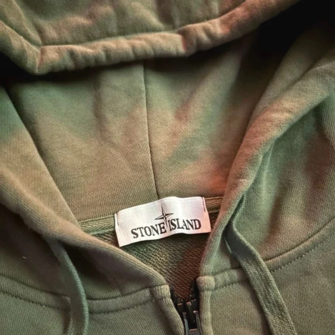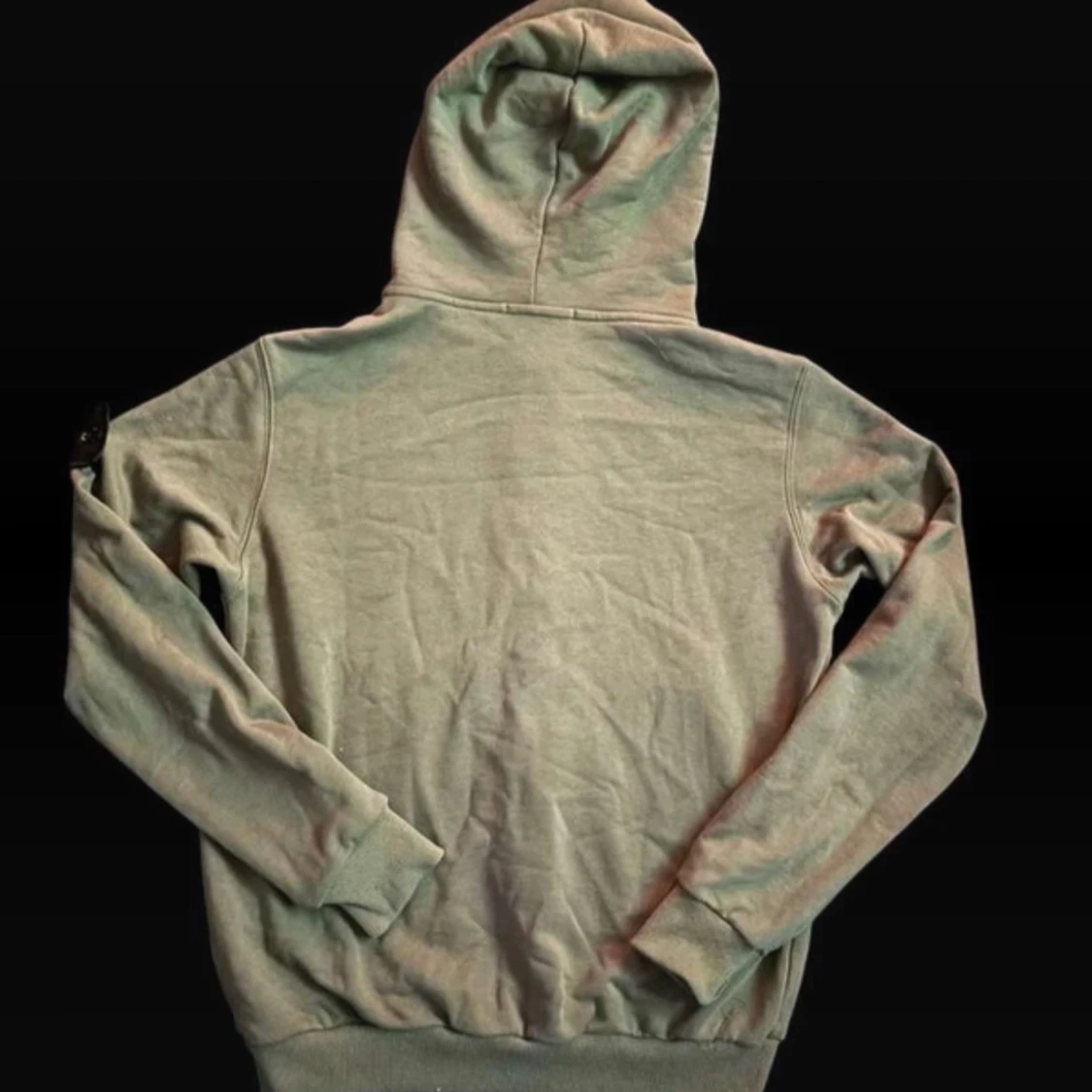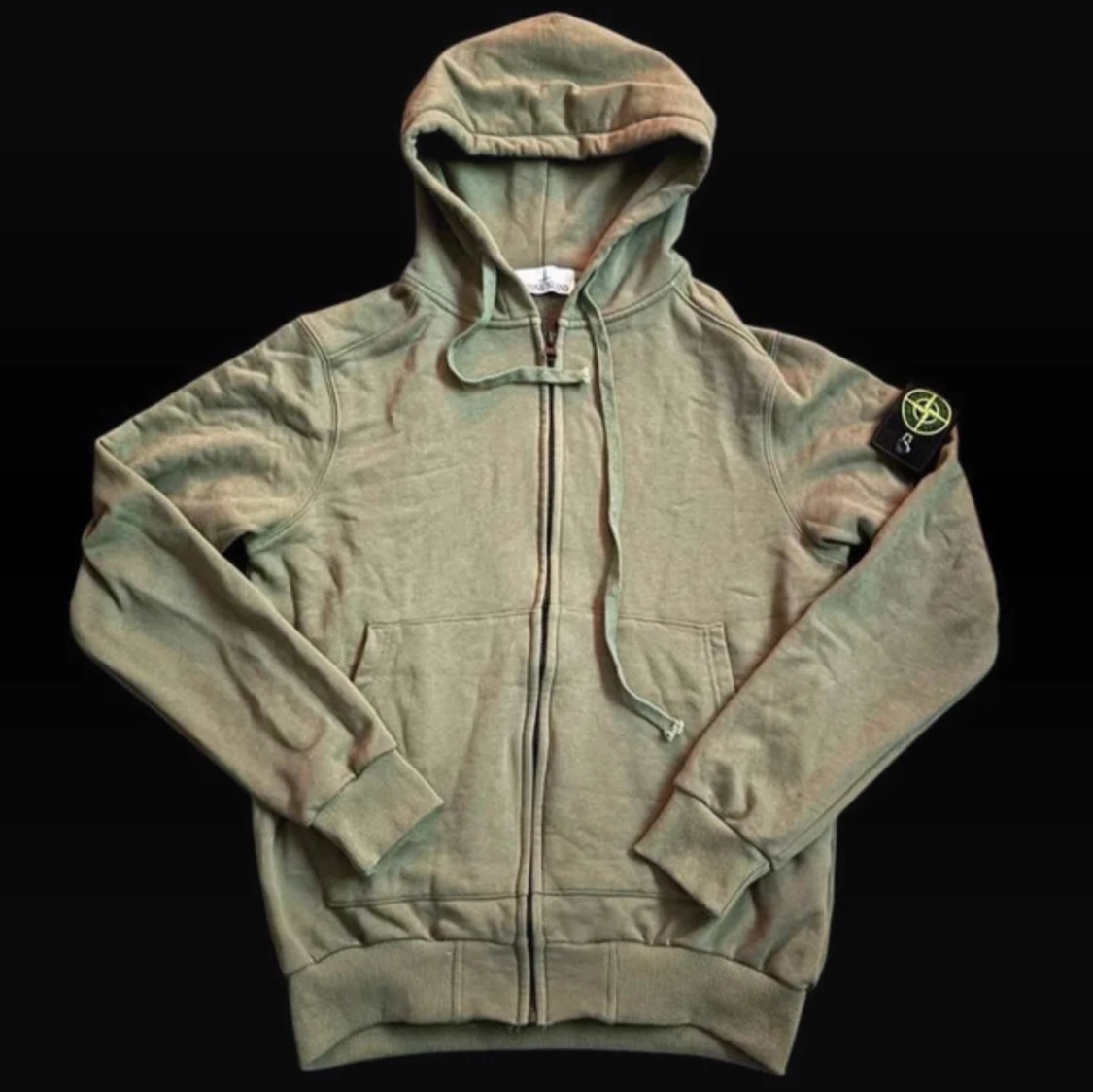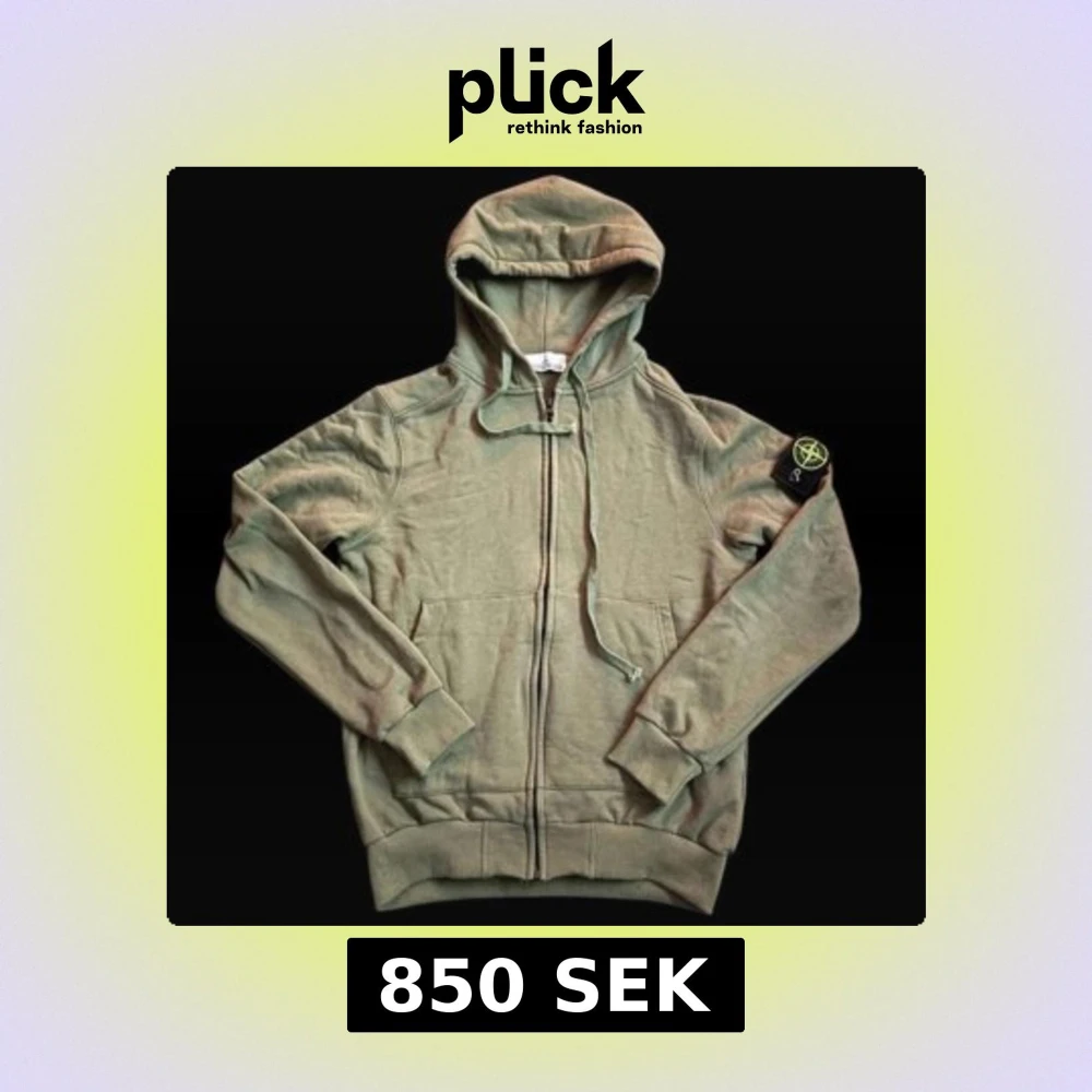 Säljer en grön hoodie från Stone Island med klassisk patch på vänster ärm. Tröjan har huva med snörning, dragkedja framtill och två fickor. Materialet är mjuk bomull och passformen är normal. Perfekt för chill dagar och streetwear-stil.