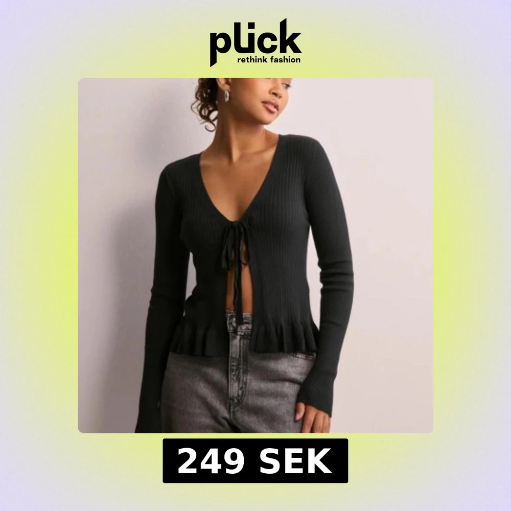 Snygg svart stickad blus från Vera moda med knytning framtill. Den har långa ärmar och en volangdetalj vid nederkanten. Perfekt för en stilren look. Köp på Nelly men från Vera moda! Aldrig använt och är i nyskick!