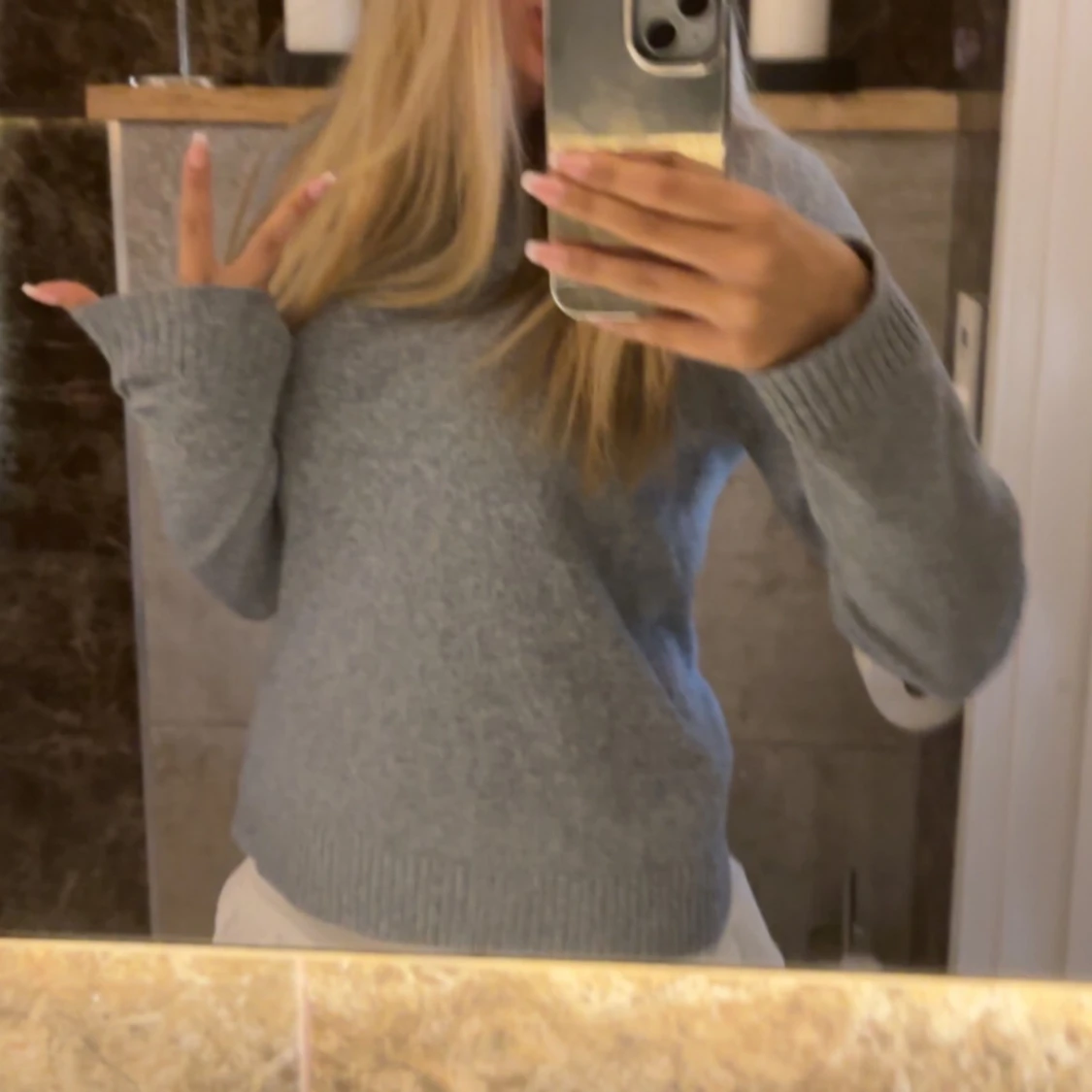 Säljer en enkel och snygg blå stickad tröja med långärmade ribbade muddar. Perfekt för dig som gillar en chill och klassisk look. Tröjan har rund hals och är mjuk mot huden, passar till jeans eller mjukisbyxor.