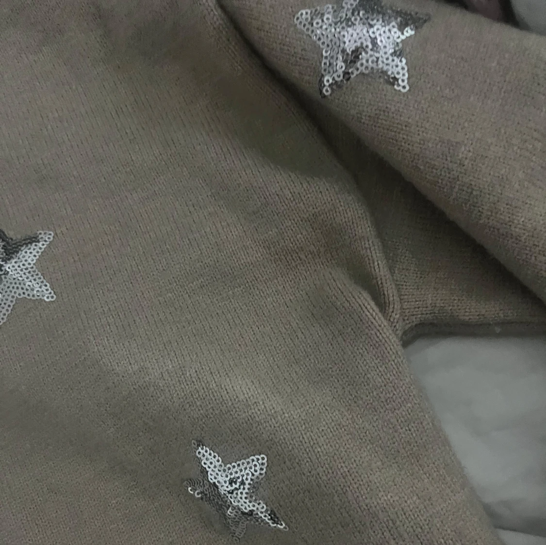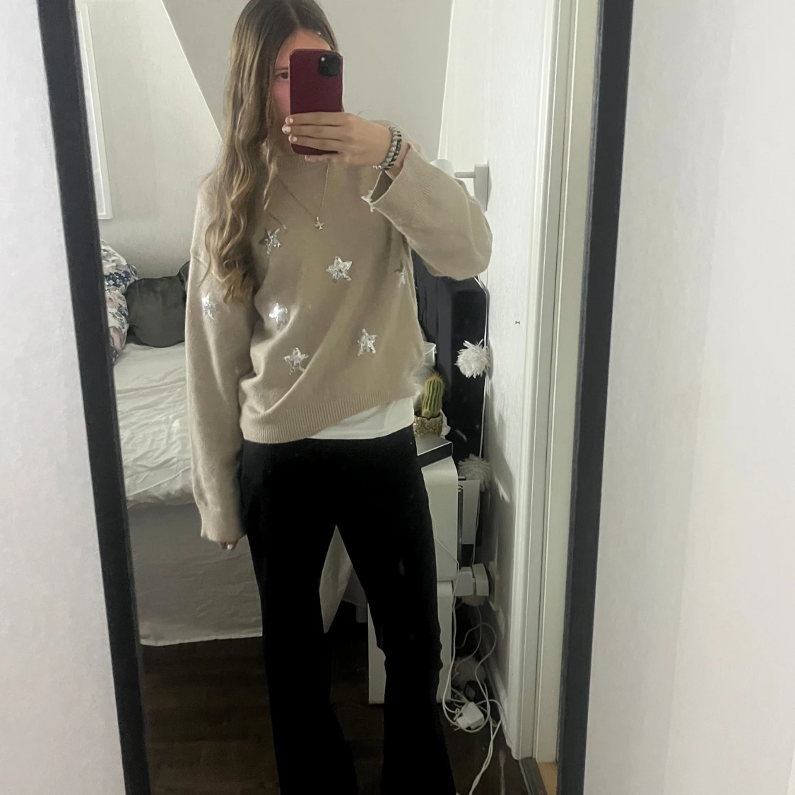 Säljer en beige stickad tröja från Gina Tricot med glittriga stjärnor. Tröjan har långa ärmar och en bekväm passform. super fin och bra skick, säljer då den aldrig kommer till användning💗