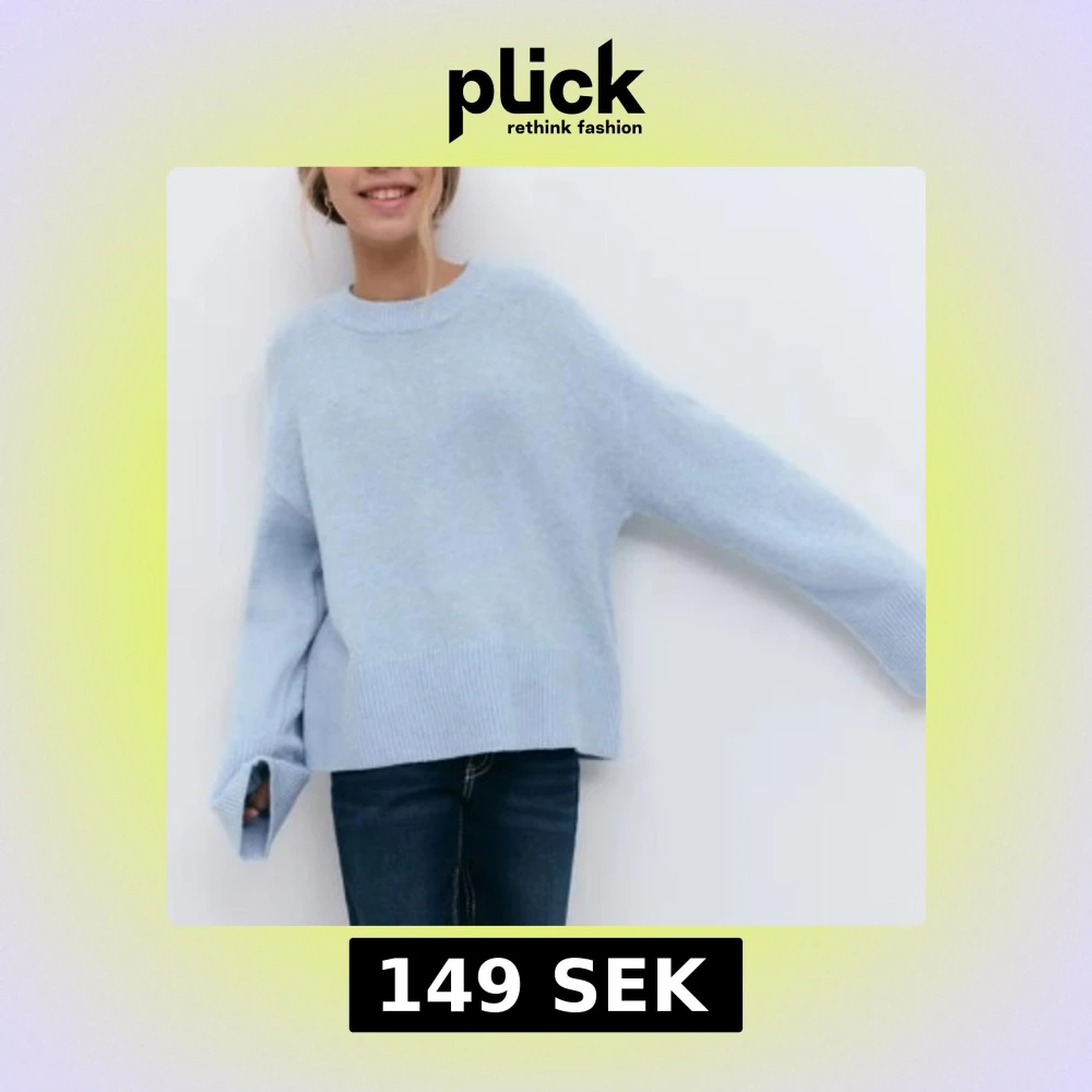 Supermysig ljusblå stickad tröja med oversized passform och breda ribbade muddar vid ärmslut och nederkant. Tröjan har rund hals och långa ärmar. Säljs inte längre på hemsidan, jag säljer för att den inte kommer till användning. Använd 1 gång. Passar vuxen xs då jag har de. Säg till om ni vill att jag ska skicka bilder!