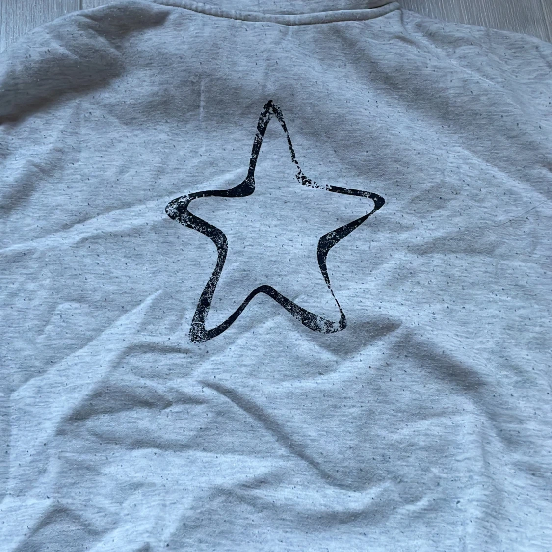 Säljer en grå hoodie från Gina Tricot med texten 'AMOUR' i svart på framsidan och en stjärna på baksidan. Hoodien har en bekväm passform och en justerbar huva med dragsko. Perfekt för en avslappnad stil.🩶