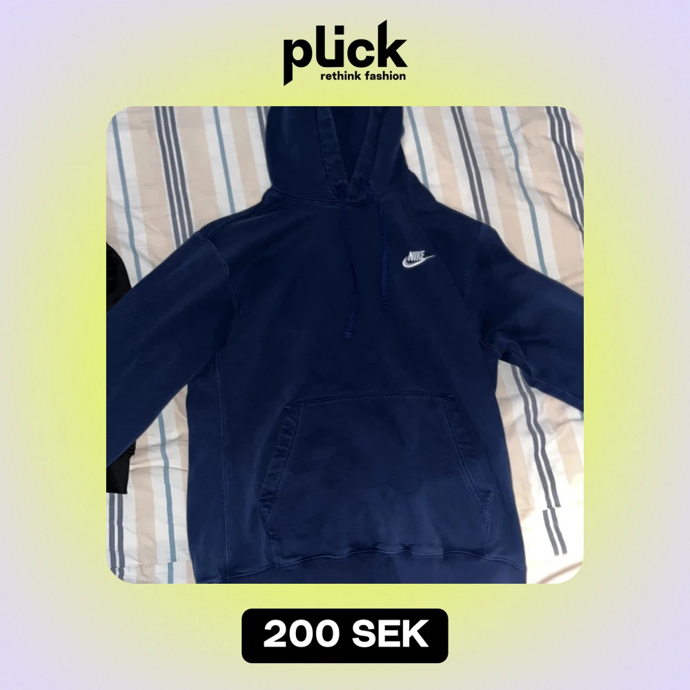 Säljer en snygg och bekväm mörkblå hoodie från Nike. Perfekt för både vardag och träning. Den har en klassisk känguruficka och Nike-loggan på bröstet. Huvan har dragsko för justerbar passform. Passar perfekt till höst och vår!