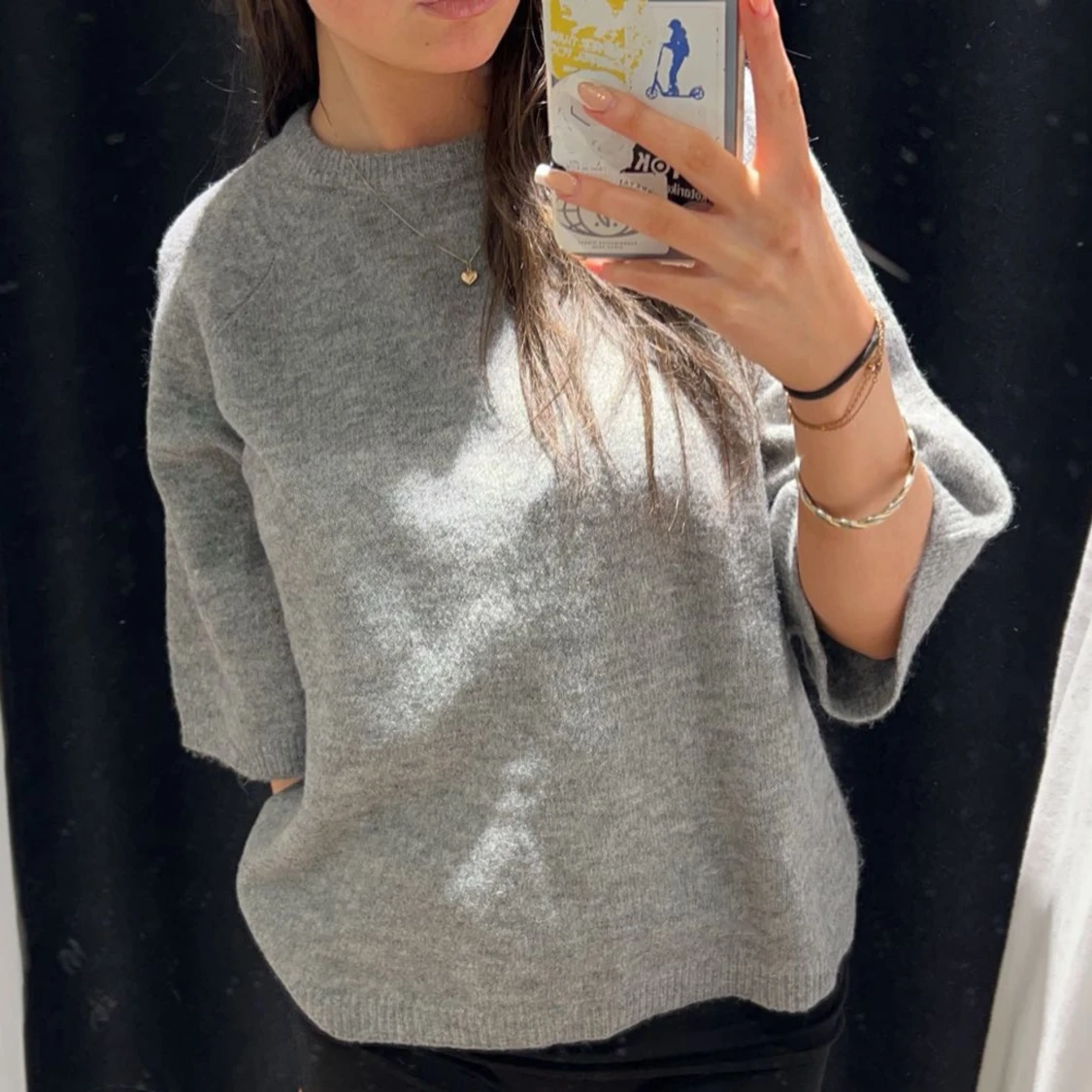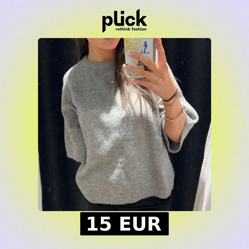 Säljer en stilren grå stickad tröja med trekvartsärm. Tröjan har en rund halsringning och en avslappnad passform.