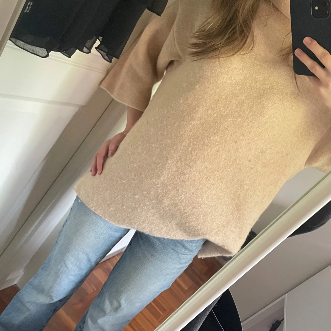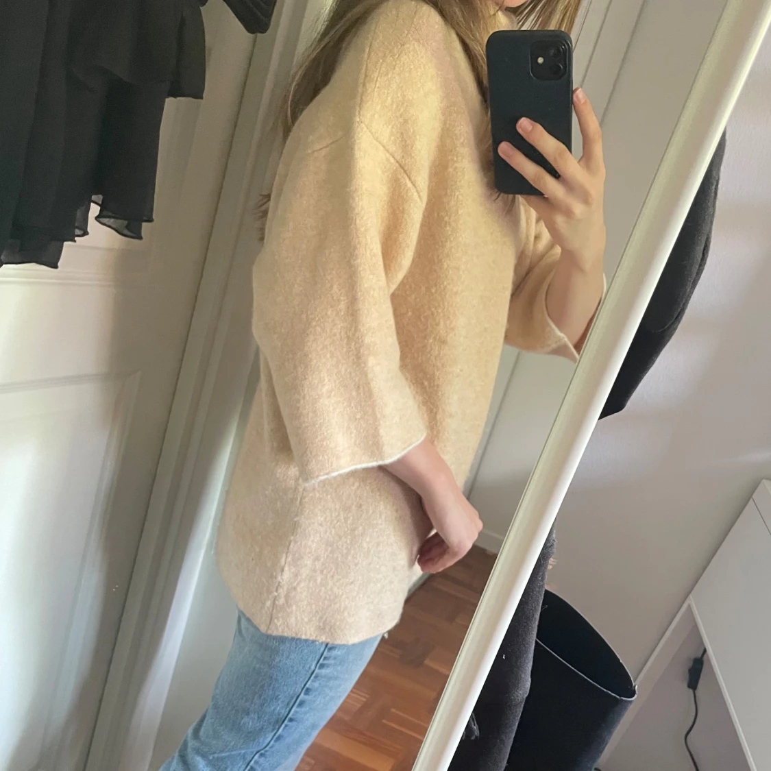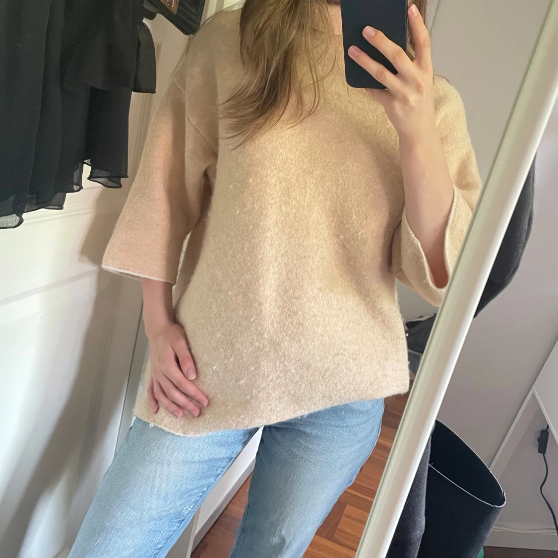 Oversized beige stickad tröja med trekvartsärmar och rund hals från Zara. Passar till jeans eller kjol för en avslappnad look. Tröjan är i storlek M, men passar mig som vanligtvis är S/XS. Använd en gång!