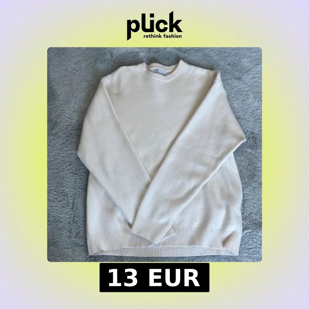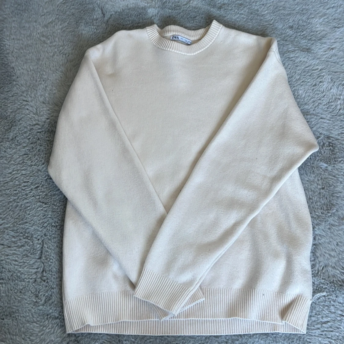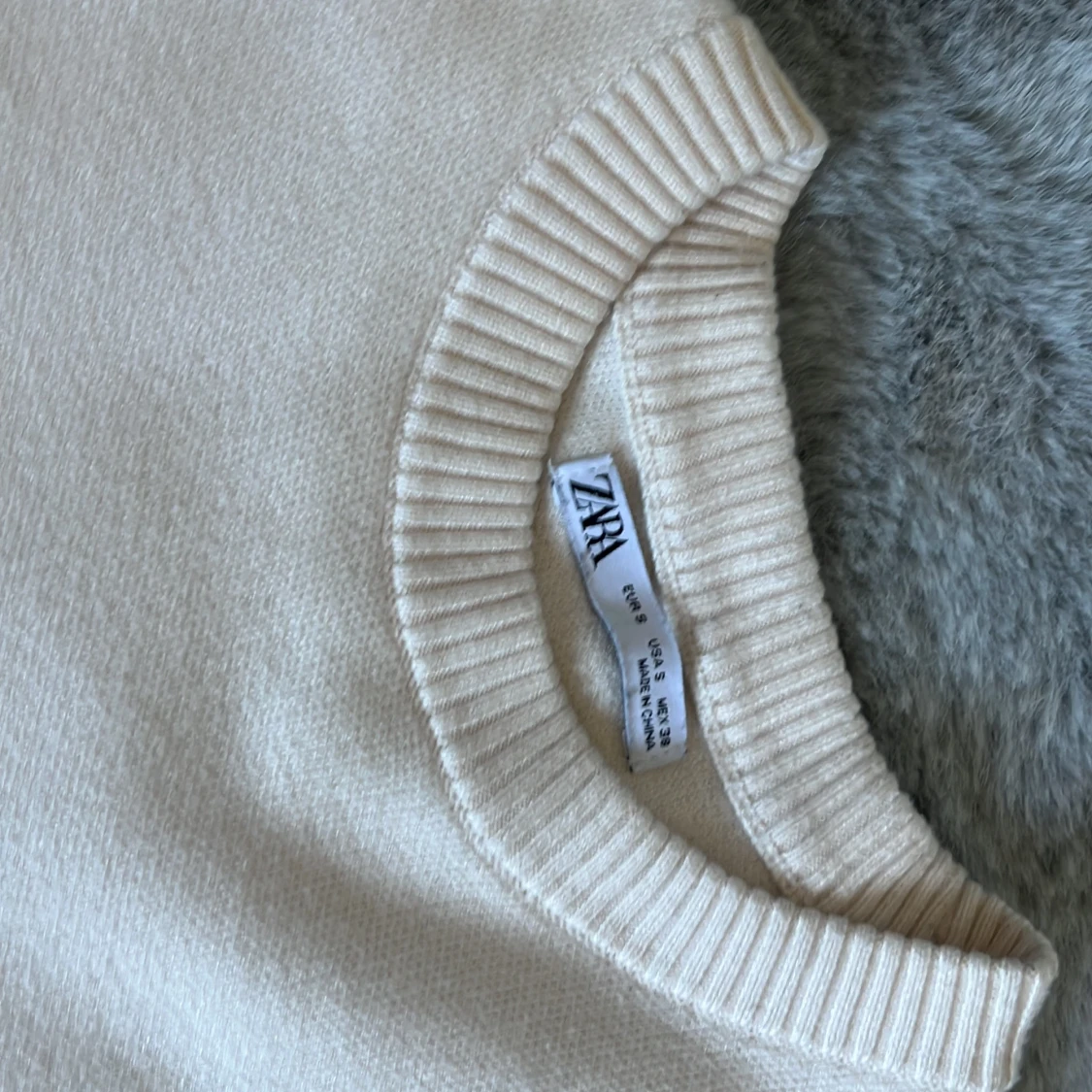 Säljer en stilren vit stickad tröja från Zara med rund halsringning och ribbade muddar. Perfekt för en clean och enkel look. Passar dig som gillar klassiska plagg med en modern touch.