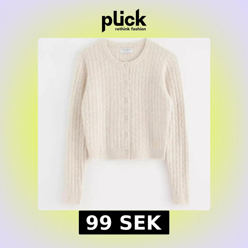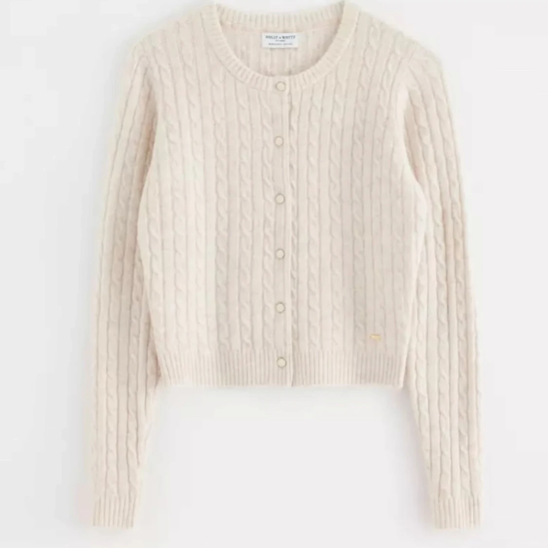 Säljer en stilren beige stickad kofta från Holly & White. Koftan har ett klassiskt flätmönster och knappar framtill. Perfekt för kyliga dagar med sin mysiga och varma design.
