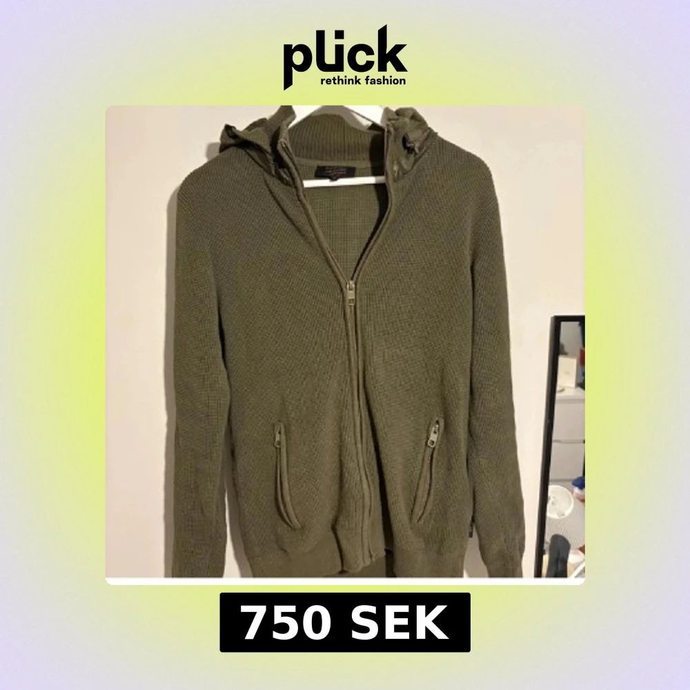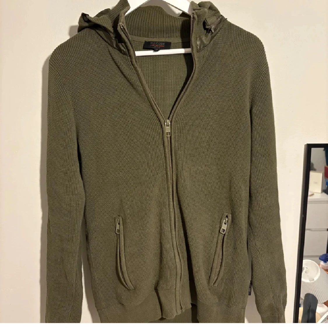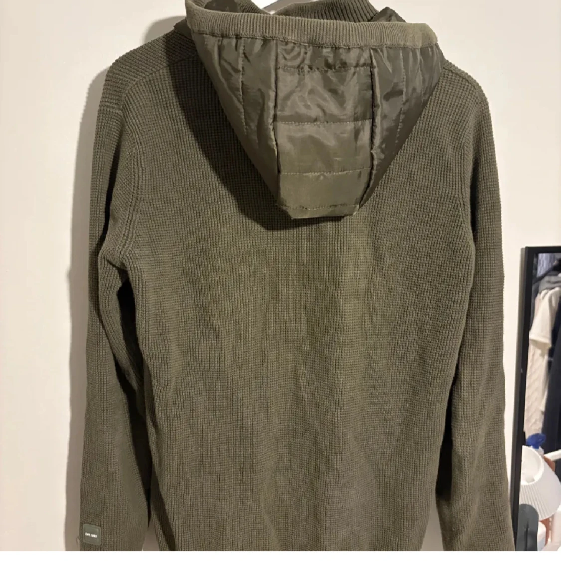 Olivgrön stickad cardigan med hdragkedja framtill och två fickor med dragkedja. Huva i quiltad polyester ger en cool kontrast till den stickade looken. Perfekt för lager-på-lager under hösten och vintern.