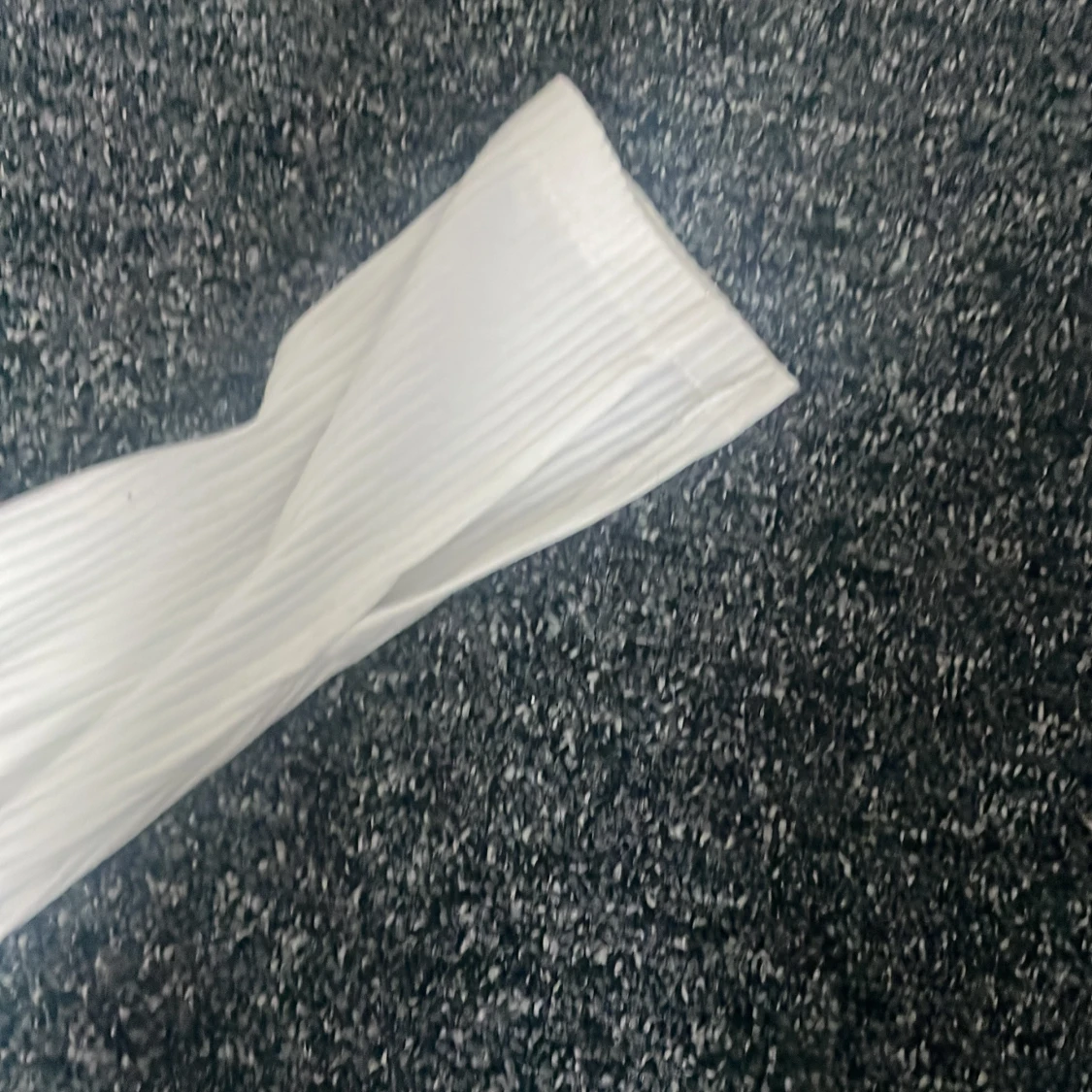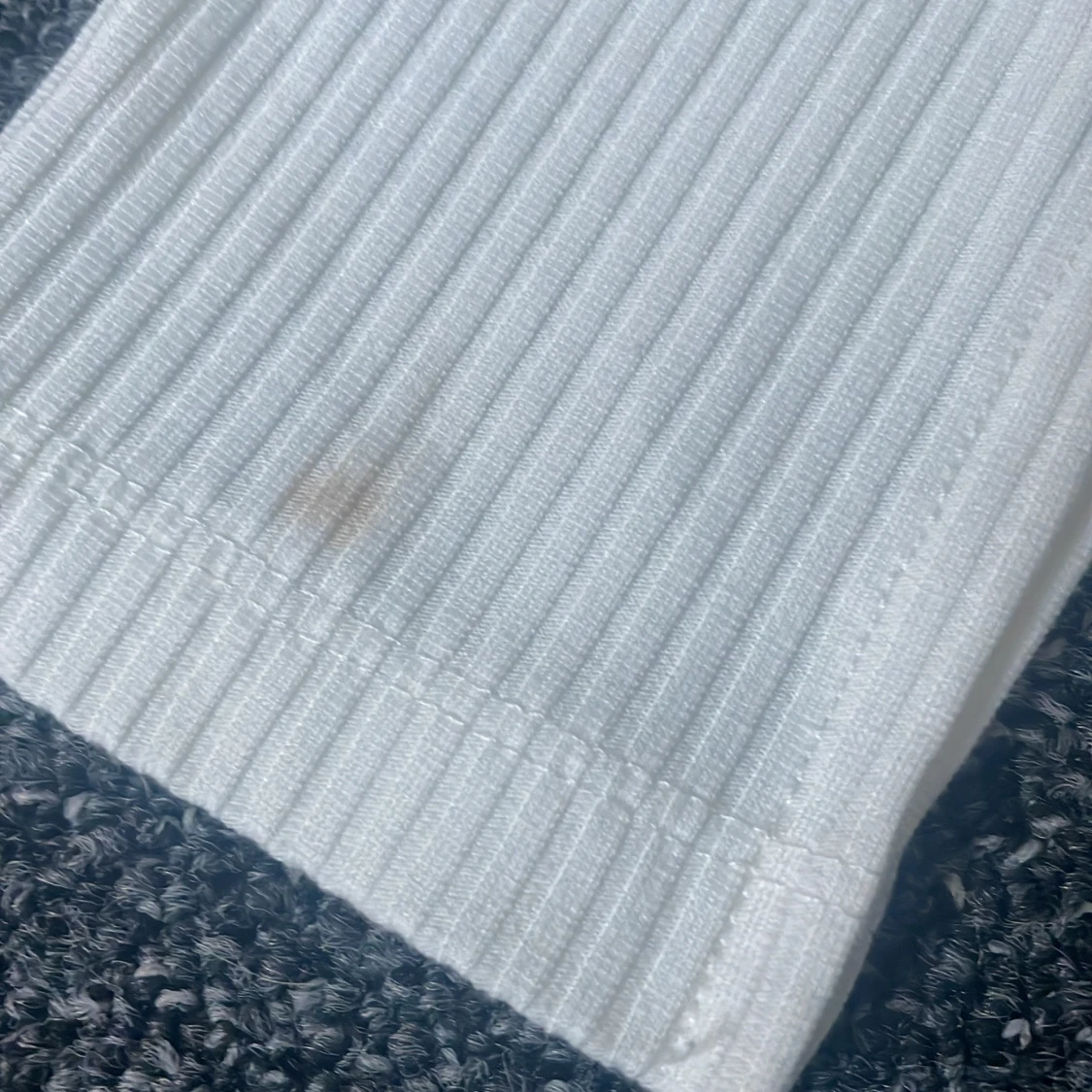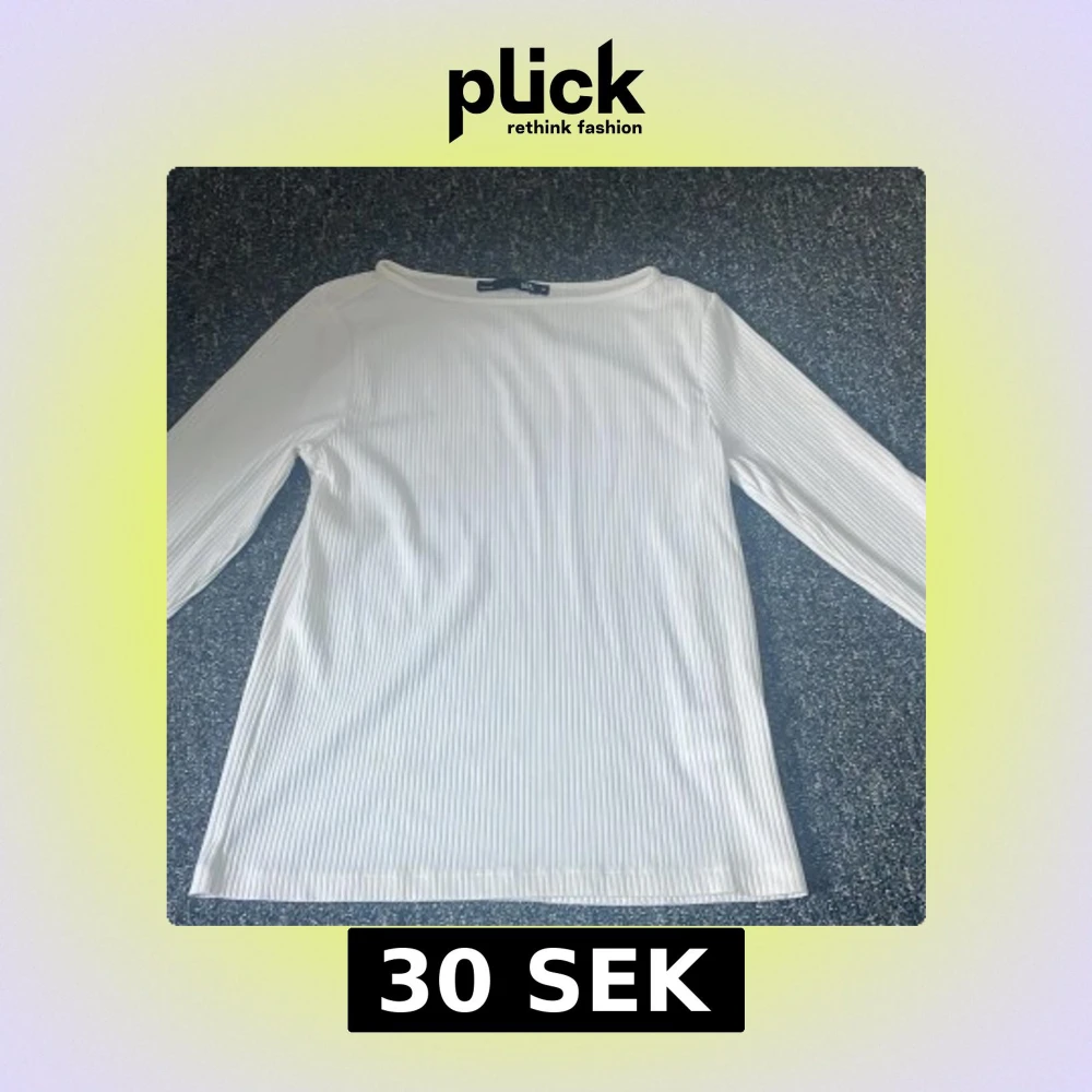 Säljer en stilren vit ribbad topp med slits ärmar. Perfekt för en enkel och snygg look. Toppen har en klassisk rund halsringning och är tillverkad i ett mjukt material. En liten smink fläck på ena armen men går att tvätta bort.