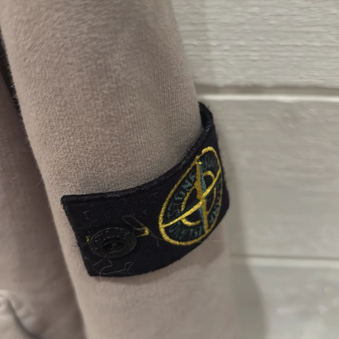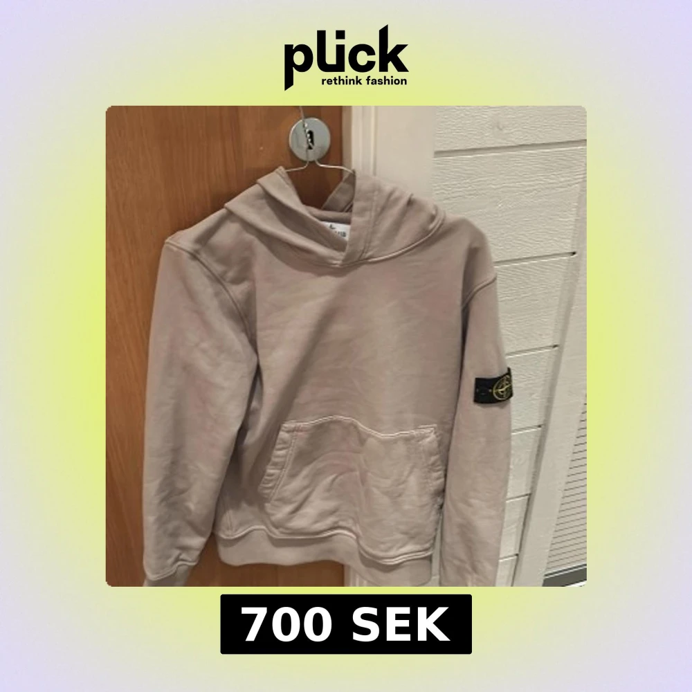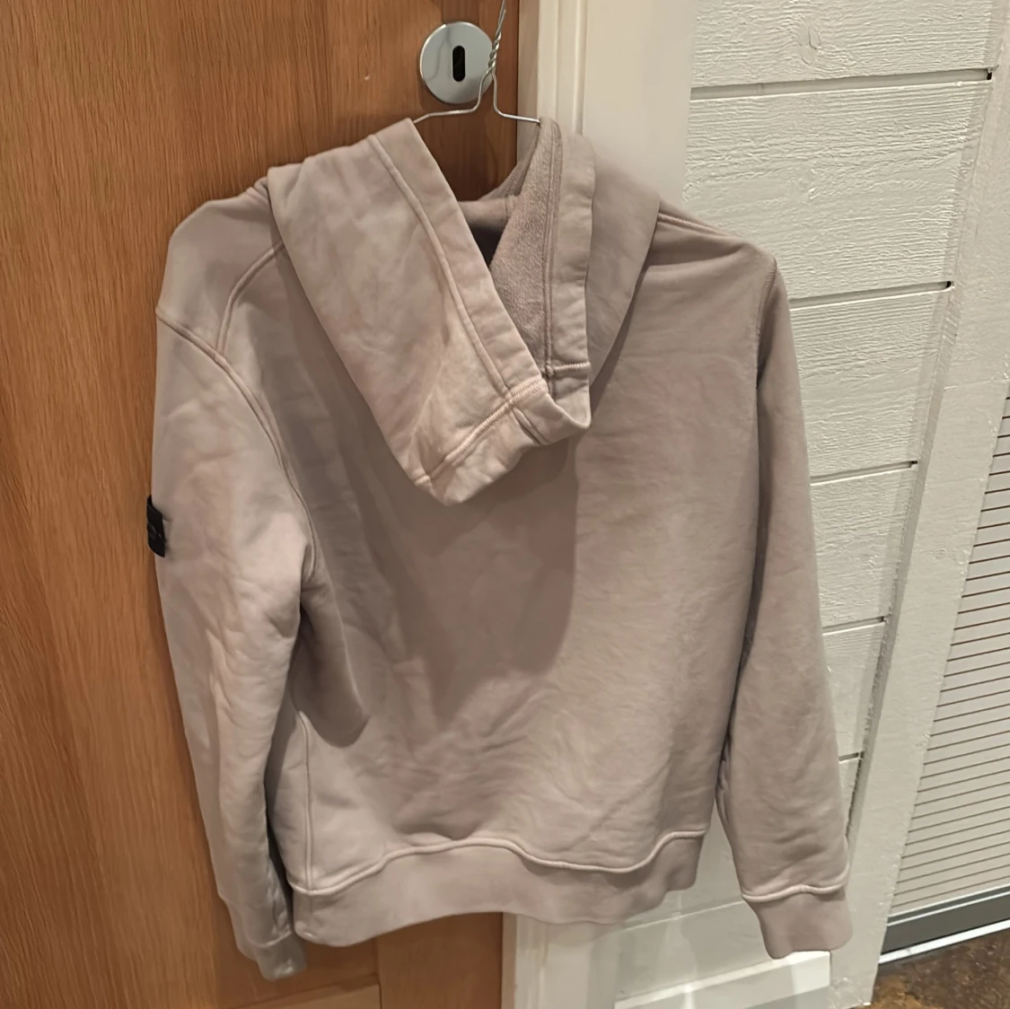 Säljer en snygg beige hoodie från Stone Island med deras ikoniska märke på ärmen. Tröjan har en stor ficka framtill och en bekväm huva. Perfekt för en avslappnad stil. Skick 10/10 och Storlek 12år