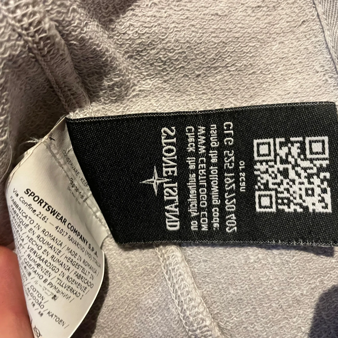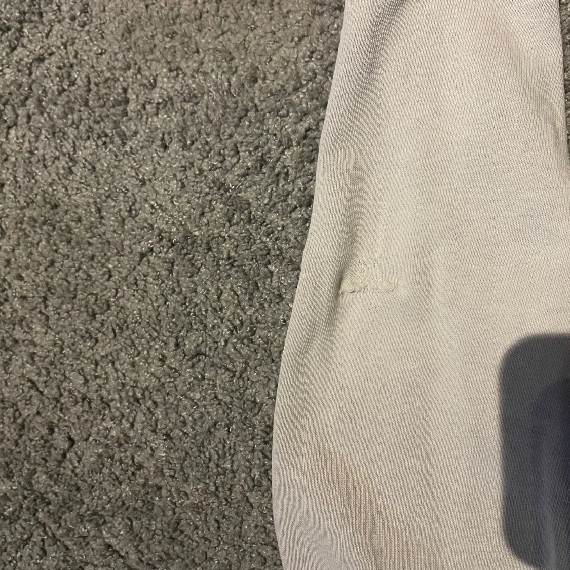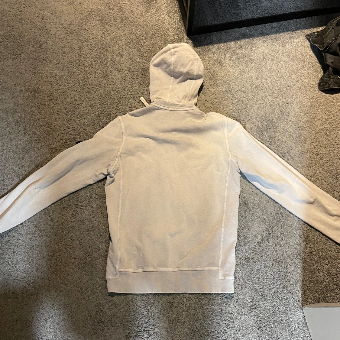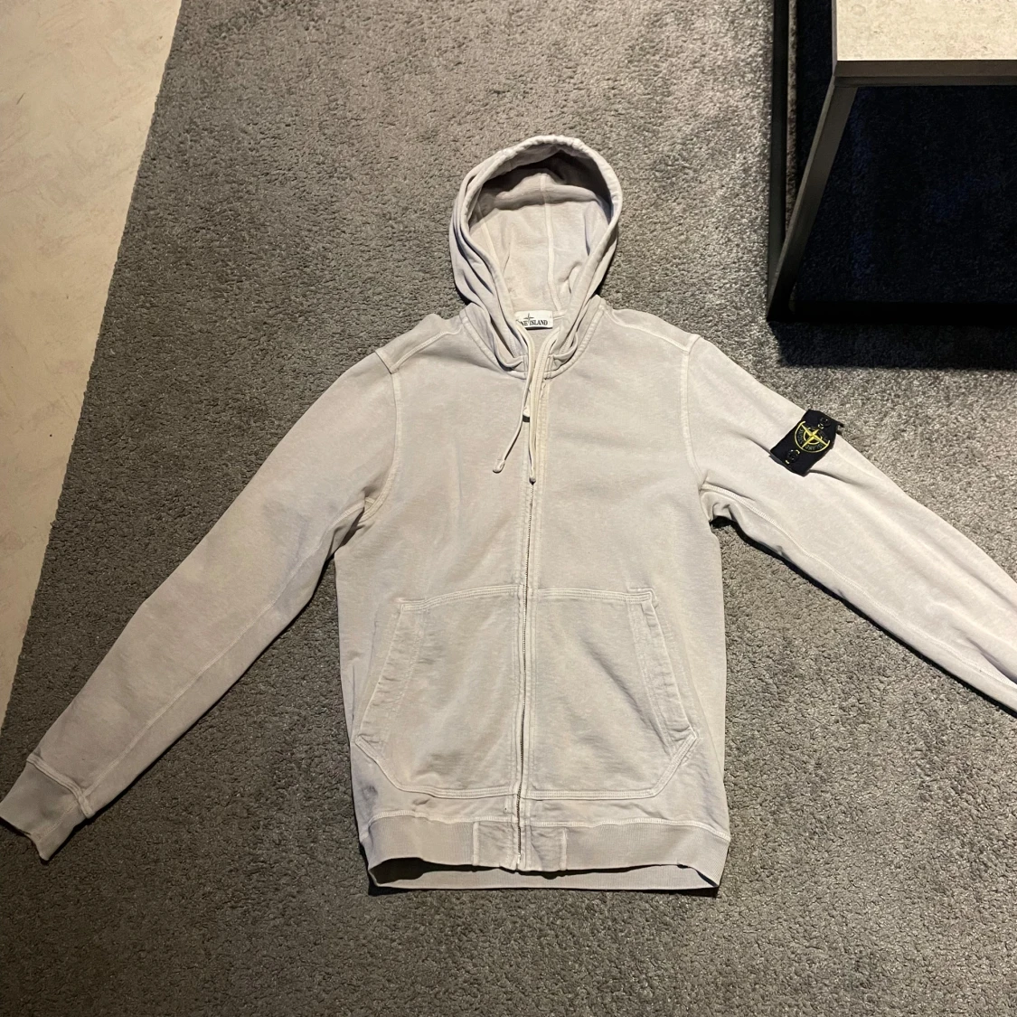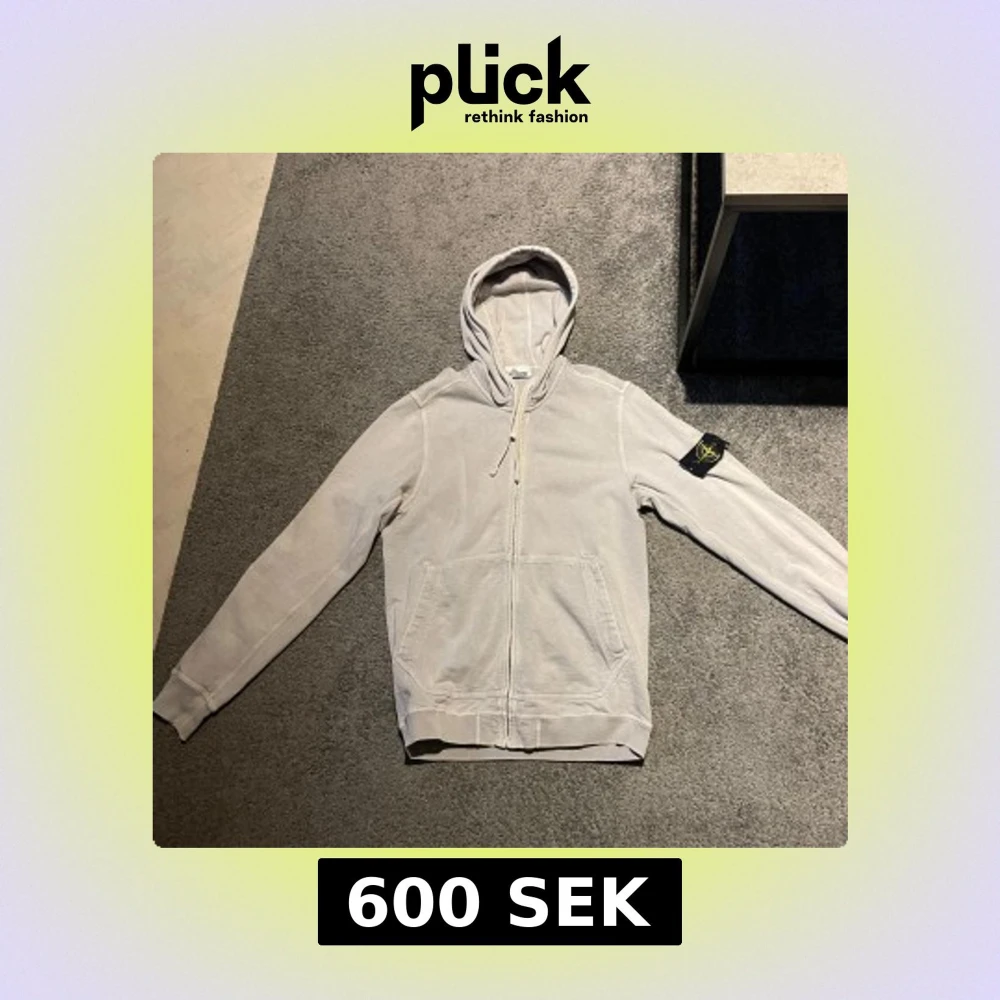 Säljer en vit hoodie från Stone Island med dragkedja och huva. Finns en liten lagning vid armbågen annars i bra skick. Storlek M