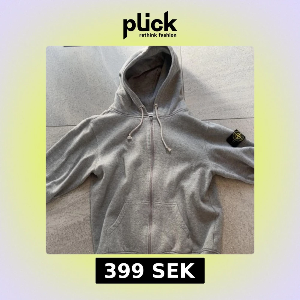 Säljer en grå hoodie från Stone Island med dragkedja och huva. Klassisk logga på ärmen och känguruficka framtill. Perfekt för en avslappnad och stilren look.