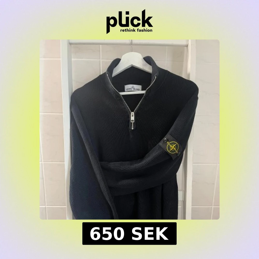 Dags att rensa garderoben och då finner vi denna tröja som jag fick för länge sedan. Svart stickad tröja från Stone Island med klassisk patch på ärmen. Tröjan har en snygg half zip-dragkedja och hög krage. Ribbstickad struktur ger en clean och modern look, perfekt för lager-på-lager. Passar dig som gillar streetwear och premiumkänsla. Qr koden på insidan av tröjan är bränd, lite riven, men allt annat ska vara i bra skick. Kvitto finns ej.