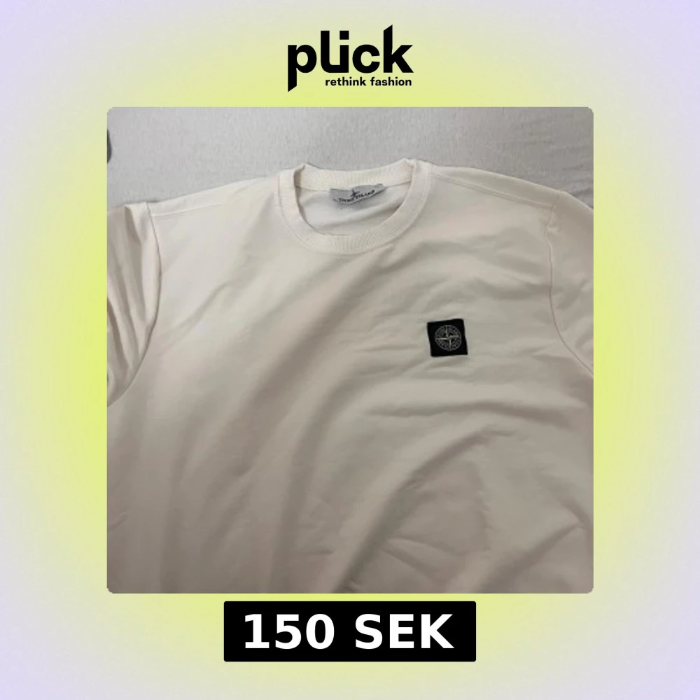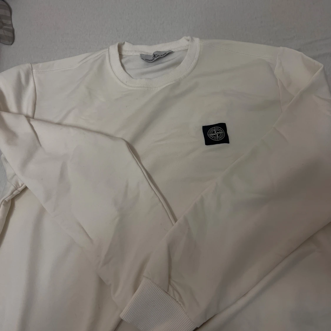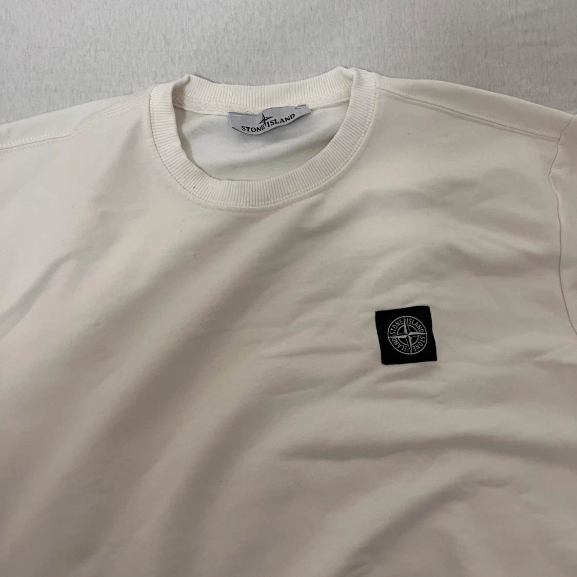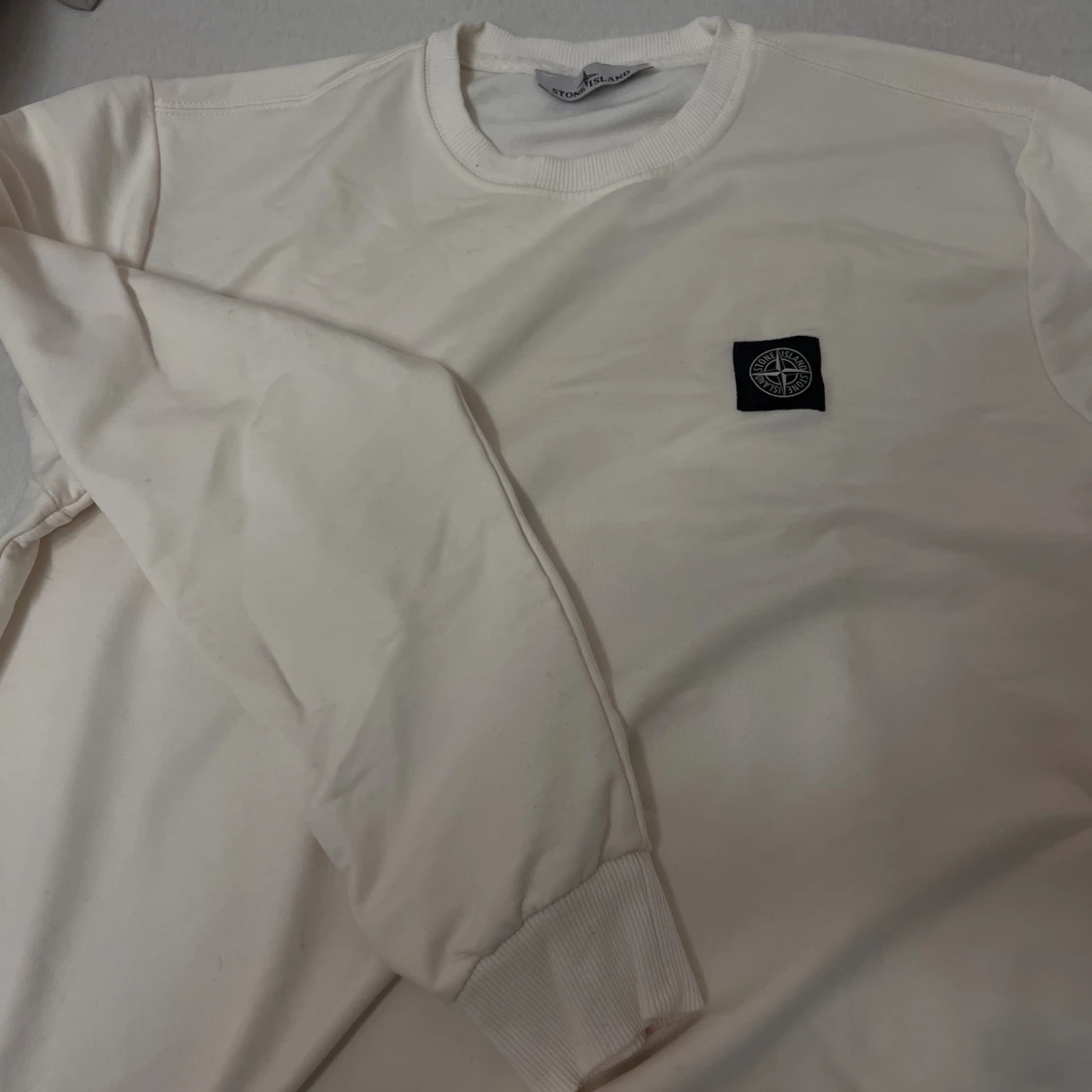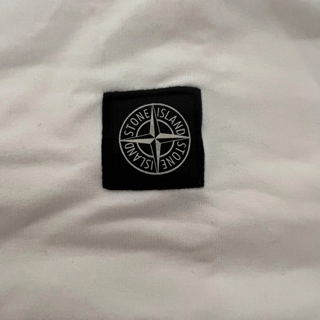 Vit långärmad sweatshirt från Stone Island med klassisk rund hals och ribbade muddar. Tröjan har en svart patch med logga på bröstet och är gjord i mjuk bomull. Perfekt för dig som gillar clean och stilren streetwear.