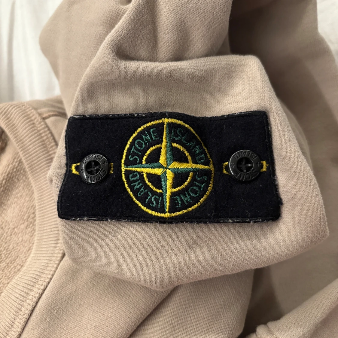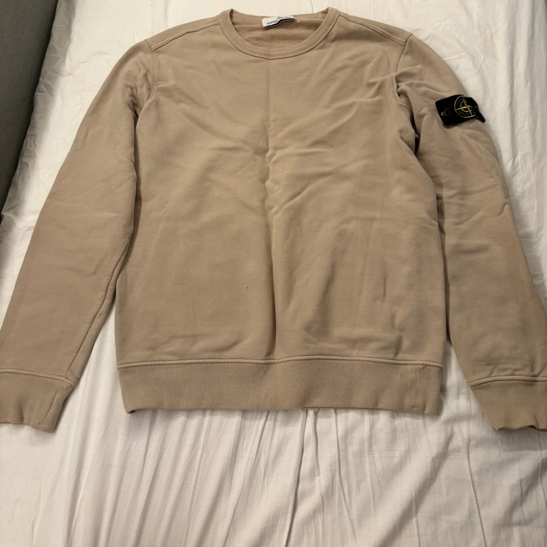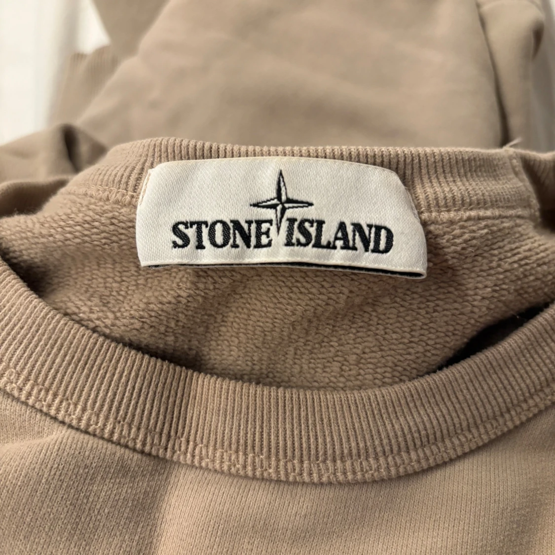 Säljer en beige sweatshirt från Stone Island med klassisk rund krage. Tröjan har Stone Island-loggan på vänster ärm. Perfekt basic med snygg passform och stilren look.