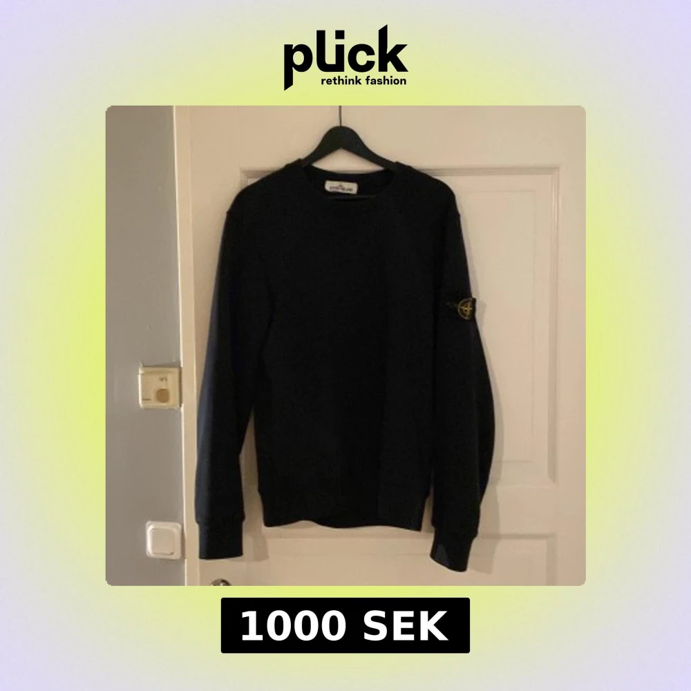 Säljer en stilren svart tröja från Stone Island med deras ikoniska märke på ärmen. Tröjan har långa ärmar och en klassisk passform. Perfekt för en avslappnad och trendig look. Storlek M