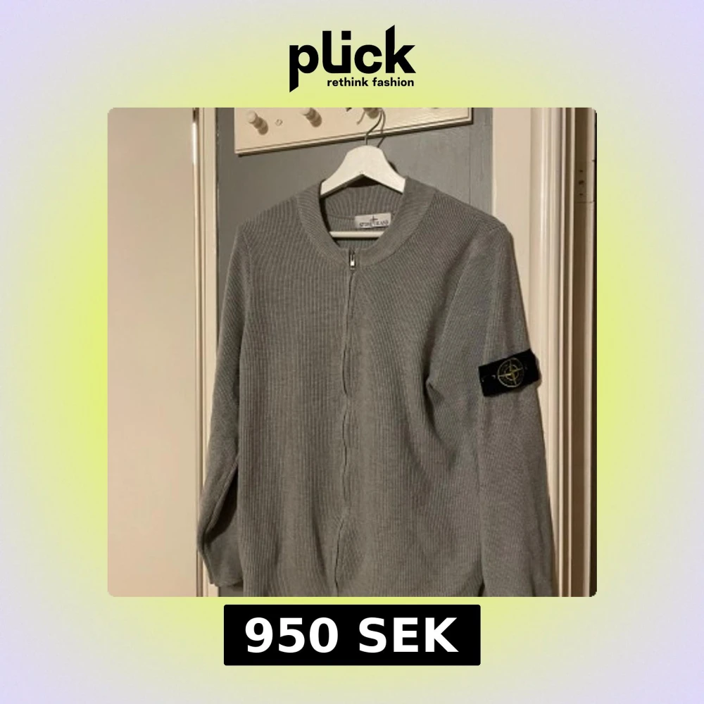Säljer en grå stickad kofta från Stone Island med dragkedja framtill och klassisk patch på ärmen. Koftan har rund halsringning och är långärmad, perfekt för lager-på-lager-stil. Ribbade detaljer ger en clean och modern look.