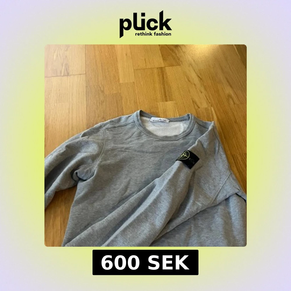 Säljer en stilren grå sweatshirt från Stone Island med klassisk rund hals och logotyp-patch på ärmen. Tröjan har en enkel design och är perfekt för en avslappnad look. Passar dig som gillar streetwear och snygga basplagg. Storlek M